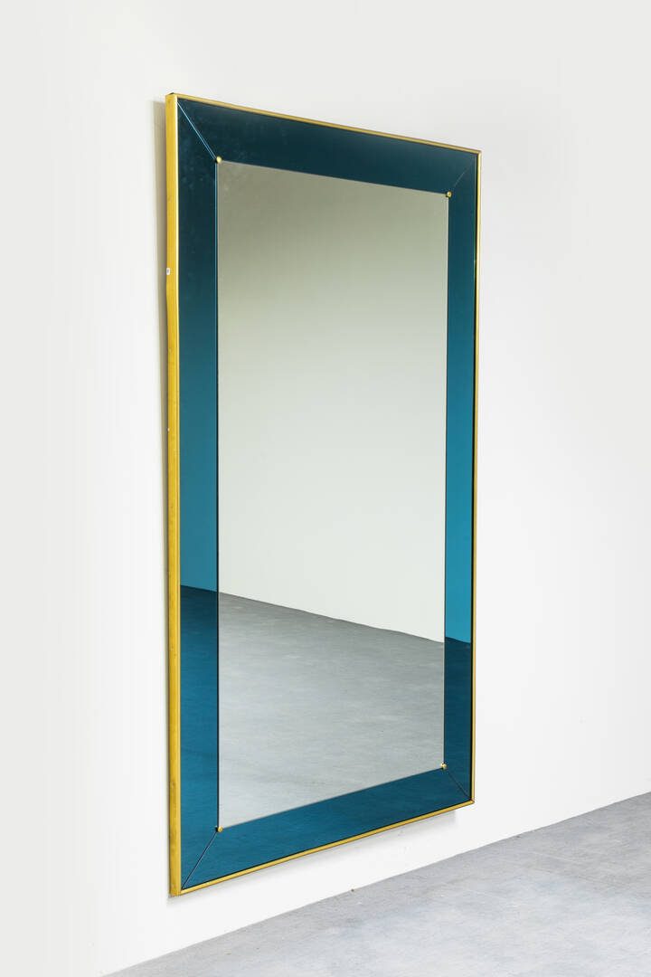 Grande specchiera con cornice in ottone cristallo specchiato e vetro colorato blu. [..]