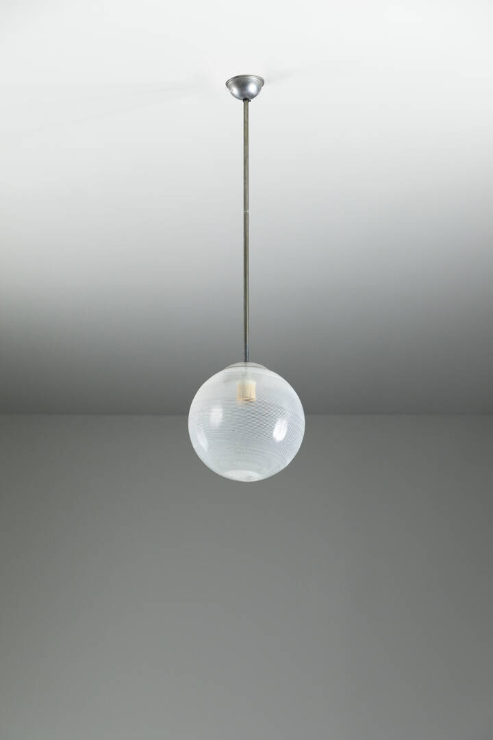Lampada a sospensione con struttura in metallo e diffusore in vetro soffiato trasparente con fili a mezza filigrana. Anni '60 h cm 70