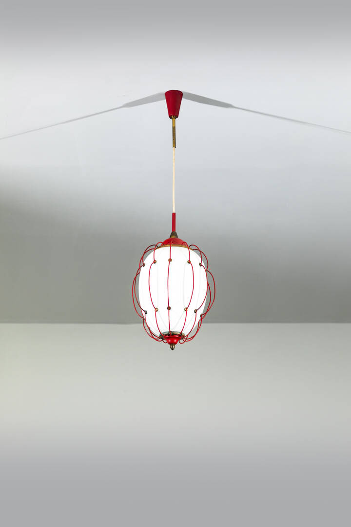 Lampada a sospensione in metallo verniciato ottone diffusore in vetro satinato. [..]