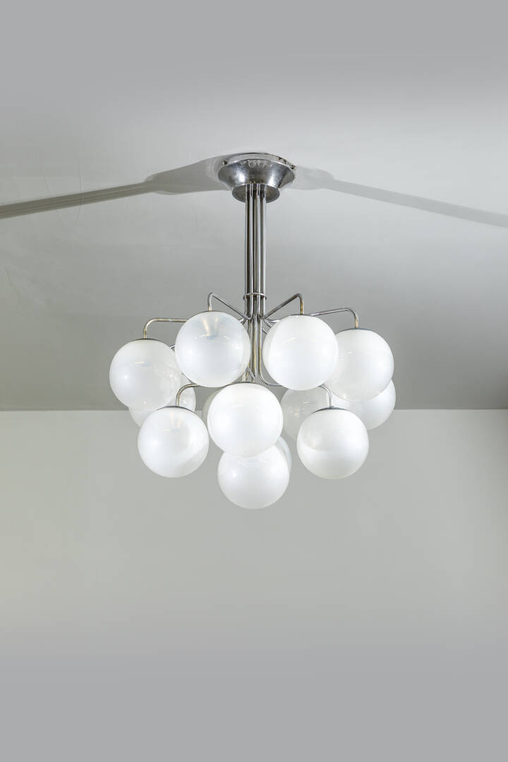 Lampadario con diffusori in vetro tige in metallo cromato. Anni '7'0 cm 95x70