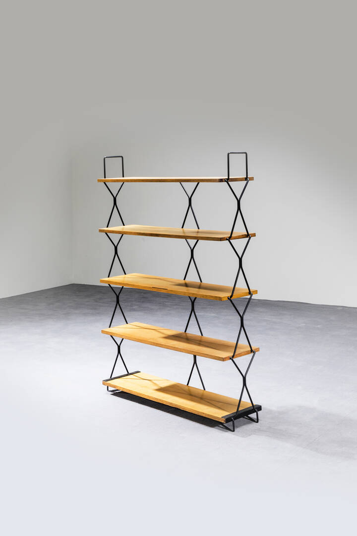 Libreria in legno chiaro montanti in tubolare di ferro verniciato. Anni '50 Etichetta [..]