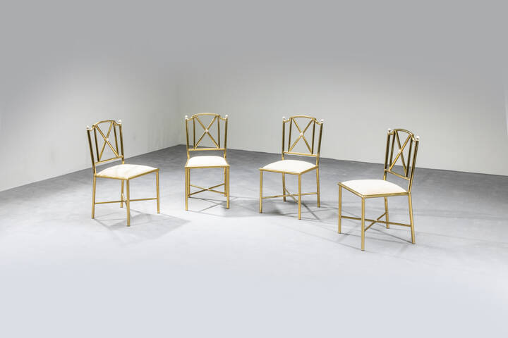 Quattro sedie con struttura in ottone cuscini imbottiti rivestiti in velluto. Anni [..]
