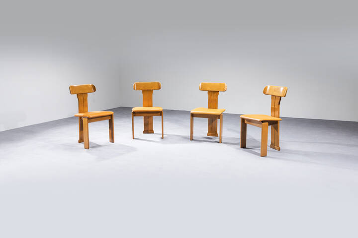 Quattro sedie in legno con seduta imbottita rivestita in vinilpelle. Prod. Mobilgirgi [..]