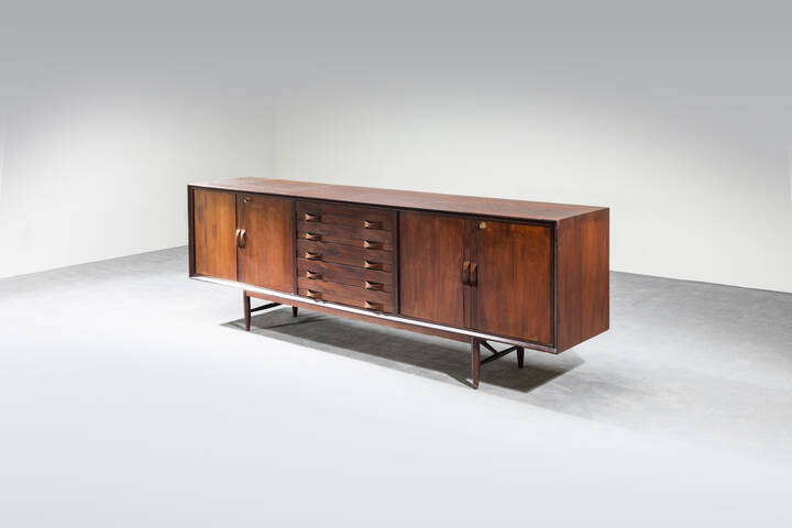 Sideboard in legno fronte a quattro sportelli e cinque cassetti. Anni '50 cm 80x240x47