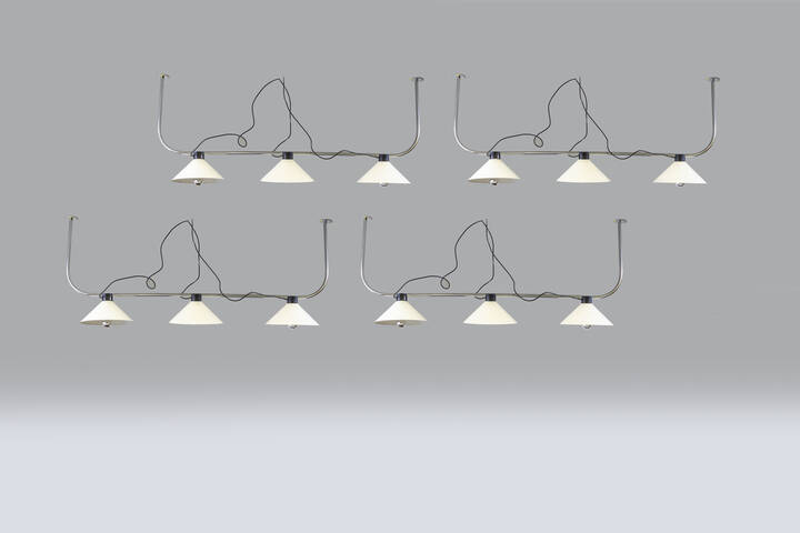 Sistema di illuminazione composto da 5 sostegni tubolari cromati con 15 diffusori conici indipendenti in alluminio smaltato posizionabili a piacere. Sostegno 125 cm cad. Anni '70