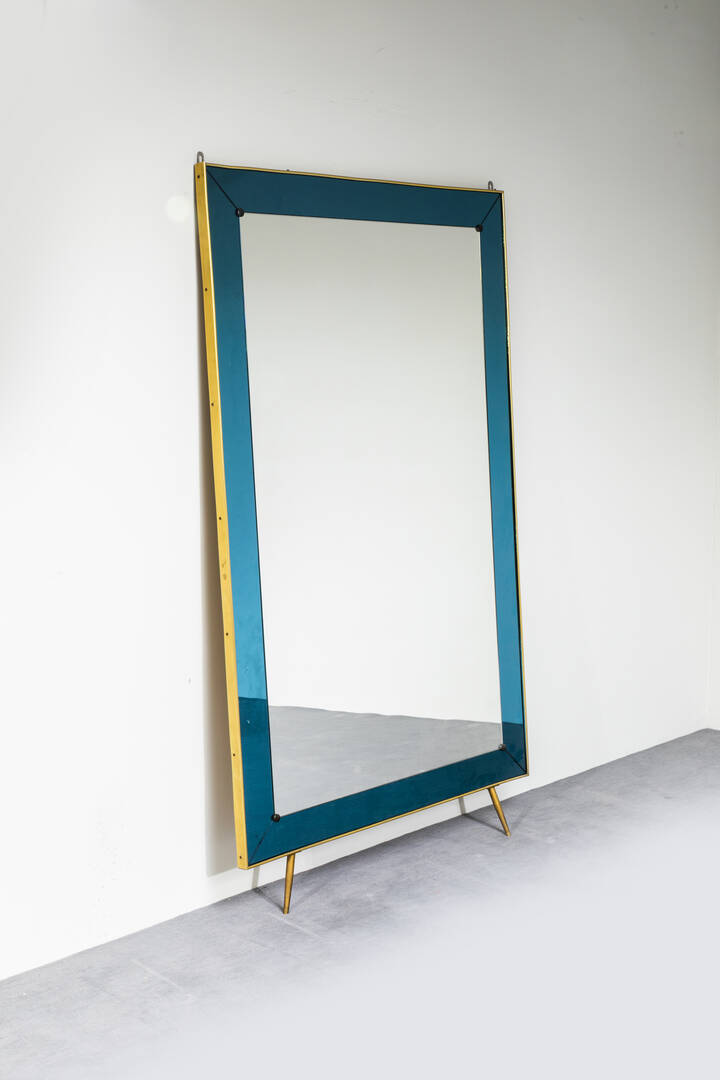 Specchiera con cornice in vetro colorato bordo in ottone. Anni '60 cm 182x107