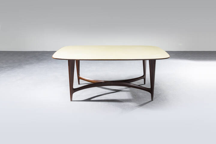 Tavolo con struttura in legno piano in vetro. Anni '50 cm 78x170x85