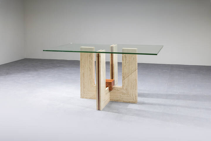 Tavolo in travertino filetti in travertino colorato piano in cristallo. Anni '60 cm 145x72x85