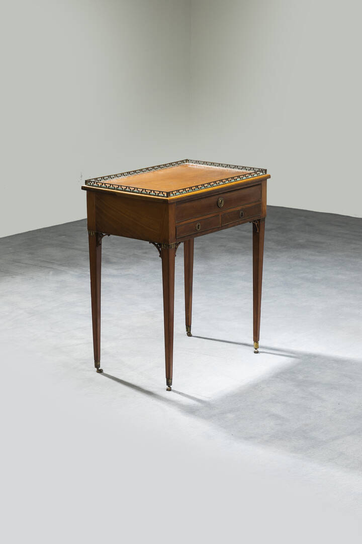 73x65x40 XX secolo in legno di noce; un cassetto e due cassettini; decori in bronzo dorato.