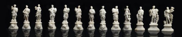 H. cm da 34.5 a 36 cm ca Tredici statuine in alabastro di cui due raffiguranti i quattro elementi; due muse e nove allegorie dei segni zodiacali Difetti e mancanze