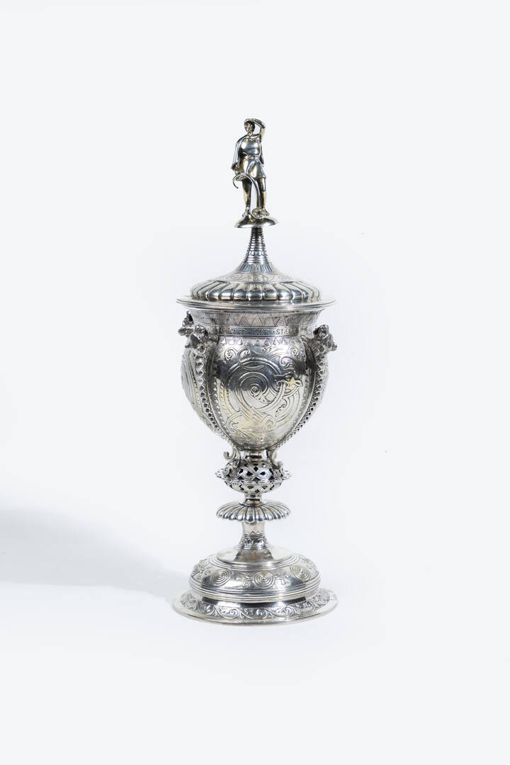 H cm 39 Non reca punzoni visibili; probabilmente Inghilterrra; reca la seguente scritta Ferdinand Andersen Cnighedgjorstaerk 1850-22 aprile-1890-gjerningen-prisermesteren; corpo bombato cesellato con motivi vegetali e geometrici decorato con teste di pantera poggiante su base circolare lavorata; coperchio con presa raffigurante una vedetta