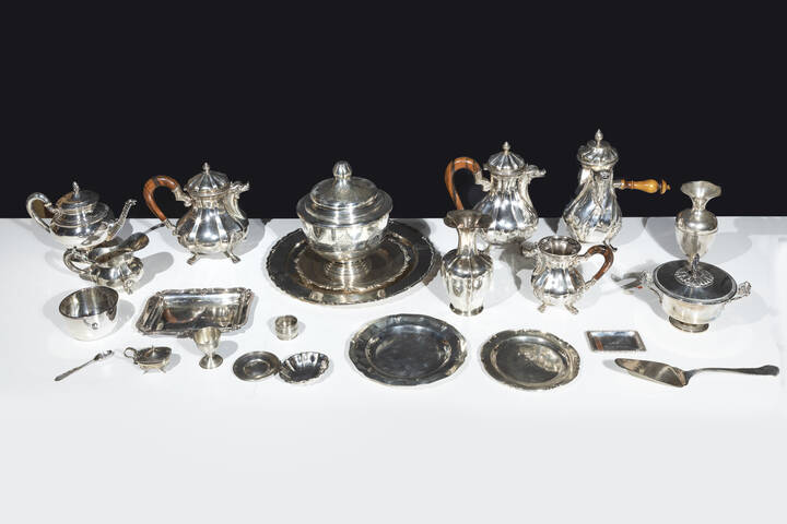 Peso complessivo gr 6782 2 composto da: -1 servizio con teiera caffettiera lattiera; corpi bombati e scanalati; prese geometriche e versatoio ad animale fantastico; manici in legno. Peos gr 2052 2 -4 piattini di varie forme e misure. Peso gr 161 1 -1 portauovo. Peso gr 10 1 -1 portatovagliolo. Peso gr 8 5 -1vassoio tondo. Peso gr 706 9 -1 zuccheriera. Peso gr 409 6 -1 teiera con corpo bombato base circolare ( ammaccatura) manico a pigna e versatoio a testa di aquila. Peso gr 402 4 -1 cioccolatiera corpo bombato lavorato a torchon; manico in legno. Difetto al coperchio. Peso gr 871 9 -1lattiera. Peso gr 284 1 -2 piccoli vasi di varia forma e misura. Peso gr 178 8 e 318 6 -1 piccola saliera con contenitore interno in vetro.Peso gr 44 4 -1 ciotola rotonda. Peso gr 114 6 -1 piccolo vassoio rettangolare. Peso gr 172 3 -2 piattini di varia forma e misura. Peso gr 464 -1 piccolo cucchiaini. Peso gr 5 9 -1 paletta da dolce. Peso gr 135 5 -1 centrotavola con coperchio. Peso gr 801 3
