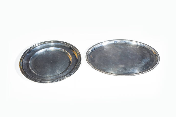 Peso gr 109 6 composto da: -1 piatto di forma rotonda. Diam. cm 29 -1 vassoio di forma ovale con bordo decorato a palmette.