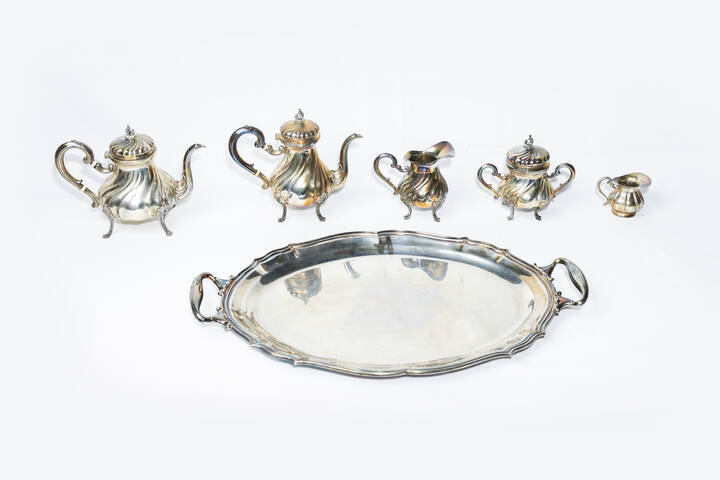 Peso gr 2695 composto da: teiera caffettiera lattiera zuccheriera vassoio ovale con manici e seconda lattiera di altro servizio.