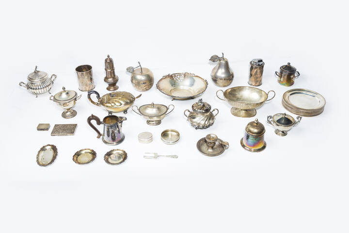 Peso gr 4462 8 composto da: -1 vaso a forma di mela parte interna in vetro. Peso lordo gr 310 8 -2 portapastiglie di varie forme e misure. peso gr 52 2 -1 piccolo vassoio. Peso gr 12 -1 tappo. Peso gr 22 6 -1 tabacchiera. Peso gr79 8 -1alzata. Peso gr 205 -2 piattini piccoli. Peso gr 15 5 -1 zuccheriera piccola. Peso gr 157.4 -12 piattini con bordo decorato a palmetta. Peso gr 1389 3 -1 centrotavola ovale con manici. Peso gr 256 5 -1 bugia. Peso gr 73 8 -1accendino con parte superiore non in argento. Peso netto 133 8 -1 portapenne. Peso gr 155 2 -1vaso a forma di pera. Peso gr 153 4 -1 pepiera. Peso gr162 7 -6 zuccheriere di varie forme e misure. Peso gr 183 1-304 2-136 1- 126 6-164 2 174 6 -1 formaggiera con cucchiaino. Peso gr315 4 -1 cucchiaino da zucchero. Peso gr 11 8 -1lattiera con manico in legno. Peso gr 177 5
