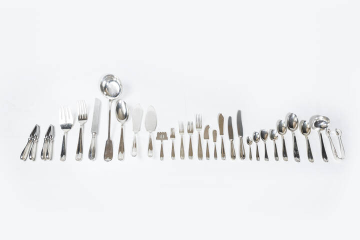 Peso gr 8532 8 composto da: -18 forchette grandi -12 forchette piccole -12 coltelli da pesce -12 forchette da pesce -12 cucchia medi -12 cucchiai da caffè -20 cucchiaini da cafè -12 cucchiai grandi -3 cucchiai da gelato -1 cucchiaino da dolce -6 cucchiaini da gelato di altro servizio -1 coltello da burro in argento 925/1000 firmato Gianmario Buccellati -12 coltello da burro in argento 925/1000 firmato Gianmario Buccellati -12 coltelli medi -18 coltelli grandi -7 pezzi da portata -1 coltello per il pane -2 schiaccianoci -3 posate da formaggio -1 pinza da zucchero
