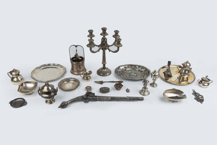 Peso netto gr 3650 2 composto da: - un fucile ornamentale lavorato e inciso a motivi vegetali Peso gr 593 - un portapastiglie tondo Peso gr 16.9 - una tabacchiera di forma ovale sblazata con figura di contadina e mucche Peso gr 55.9 - due alzate di varie forme e misure Peso gr 230.7 - un ciondolo di forma ovale in argento 900/100 Peso gr 9.3 - una ciotolina di forma esagonale con manici non in argento Peso gr 32.7 - un acquasantiera piccola Peso gr 53.1 - ciotolina con due manici lavorata a volute Peso gr 39.8 - piccolo pozzo ornamentale Peso gr 430.7 - tre piatti di varie forme e misure Peso gr 747.5 - piccola cazzuola con manico in legno Peso lordo 48.5 - piccola scultura raffigurante fanciullo con cestra e bastone poggiante su base con piedi leonini Peso gr 103.3 (controlla punzoni) - zuccheriera corpo bombato decorata con fascia a motivi vegetale coperchio con presa a ghirlanda e manici con elementi in legno Peso gr 236.2 - piccola pisside Peso gr 81.4 (controlla punzoni) - piccolo servizio in argento composto da: teiera caffettiera zuccheriera e lattiera Peso gr 614.9 - vassoio di forma ovale sbalzato con scena di guerra Peso gr 315.8 - una sculturina raffigurante maschera carnevalesca firmata Gino Bottazzo Peso gr 143.0 - candeliere a cinque luci decorato a motivi geomentrici. Base circolare in legno Peso lordo 899.6