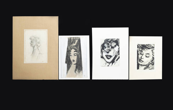 1 - 25 5xx18 matita grassa su carta applicata su cartoncino applicato su cartone pesante colorato e risvoltato che contiene un cartoncino bianco leggero 2 - 38x19 china carboncino e tempera su cartoncino applicato su cartoncino 3 - 23x15 carboncino e guazzo su carta applicata su cartoncino a sua volta applicato su cartoncino 4 - 24 5x17 carboncino e guazzo su cartoncino parzialmente applicato su cartoncino pubblicitario 1 - Opera firmata in basso a destra; data titolo tecnica e misure su foglietto applicato al retro del cartoncino bianco 2 - Opera siglata in basso a destra; data titolo tecnica e misure al retro del cartoncino 3 - Opera firmata in basso a destra; data titolo tecnica e misure al retro del cartoncino 4 - Opera siglata in basso a destra; data titolo tecnica e misure al retro del cartoncimo