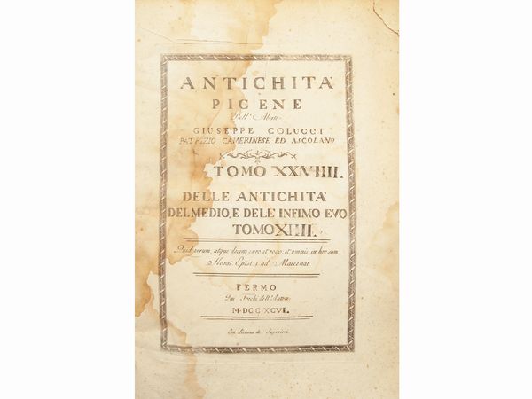 All'occhietto diverso titolo e indicazione di tomo: Antichità picene. Tomo XXIX delle antichità del Medio, e dell'infimo evo. Belle iniziali e testatine incise, finalini xilografici.