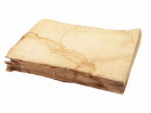 Legatura cartonata con titolo calligrafico al dorso, con strappi, gore d'acqua ai piatti. Fioriture, evidenti gore d'acqua, macchie, tracce di muffa. Ultime c. con ingenti danni
