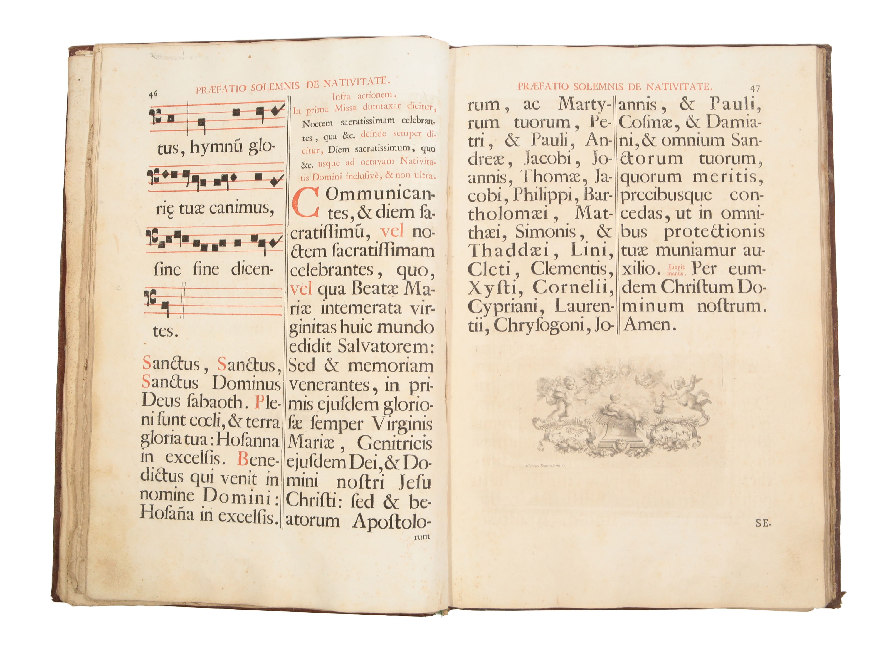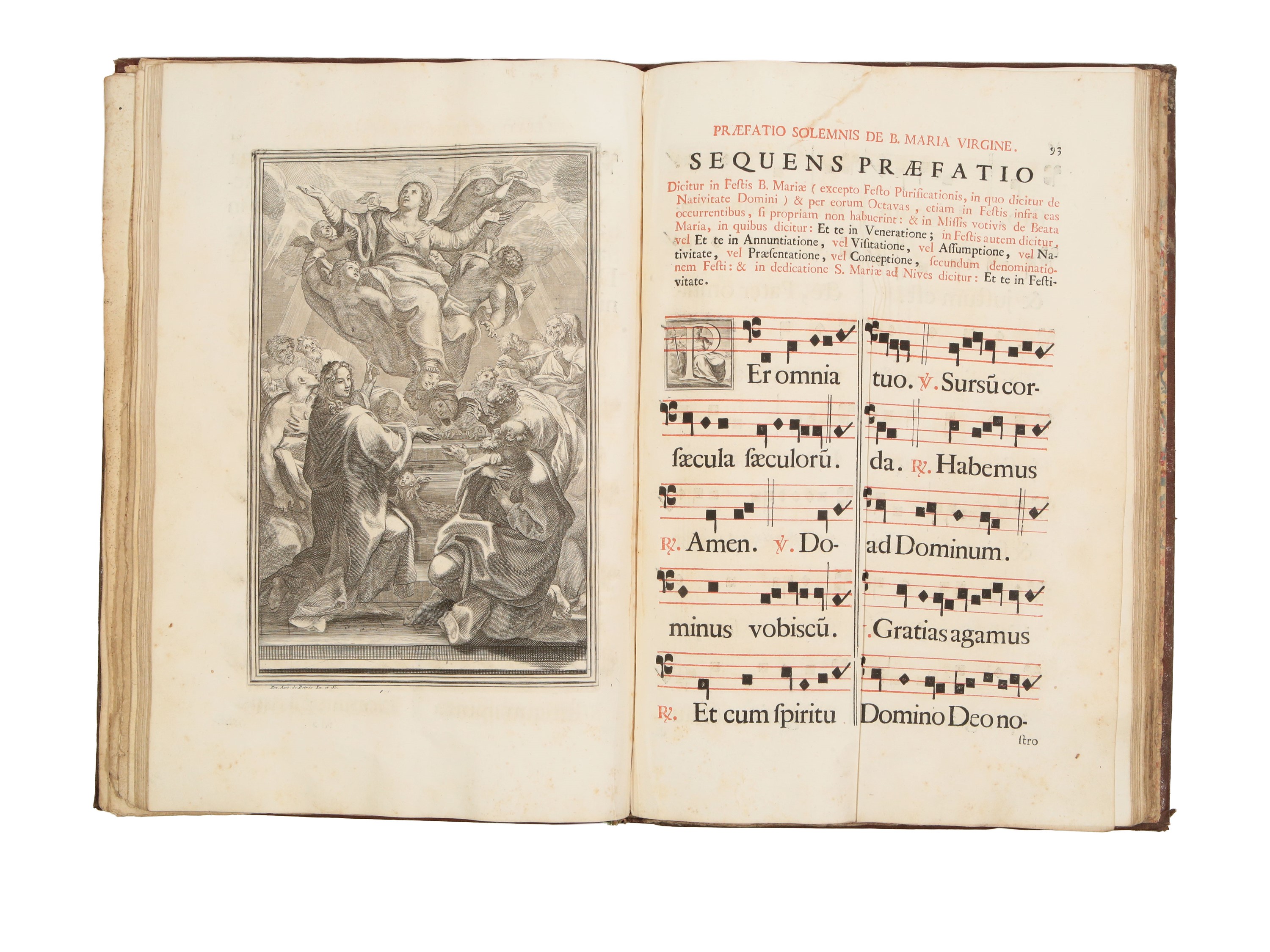 Frontespizio in rosso e nero con vignetta incisa. Testo su due colonne, anch'esso stampato in rosso e nero, illustrato da 16 tavole incise, con canti con notazione gregoriana, iniziali figurate, finalini incisi, intitolazioni entro belle cornici calcografiche.
