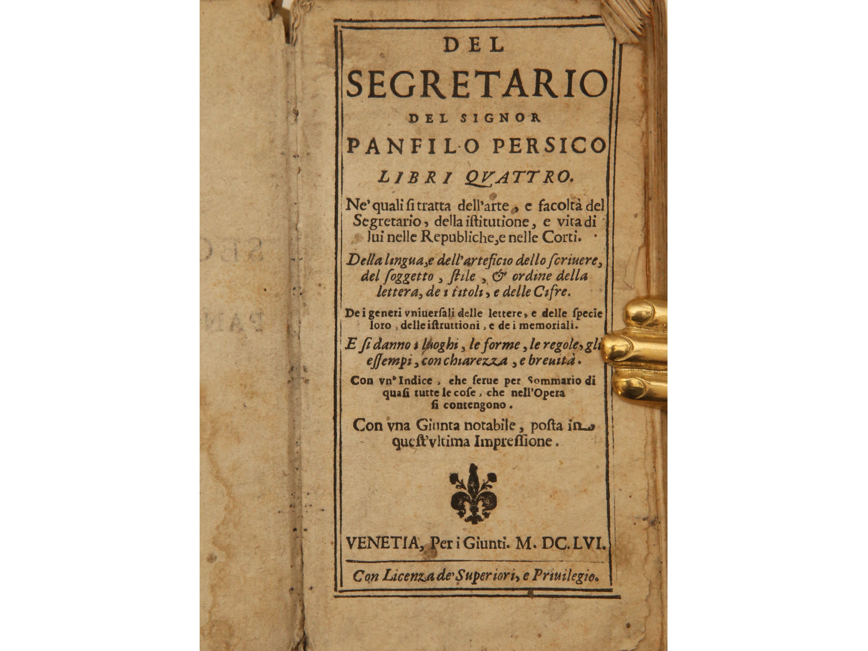...Ne' quali si tratta dell'arte, e facoltà del Segretario, della istitutione, e vita di lui nelle Repubbliche e nelle Corti. [...] Con una Giunta notabile, posta in quest'ultima impressione. Segue (pp. 433-454) con proprio frontespizio: Aggiunta di lettere scelte dagli originali manoscritti dell'illustriss. monsig. Giovanni Ciampoli.