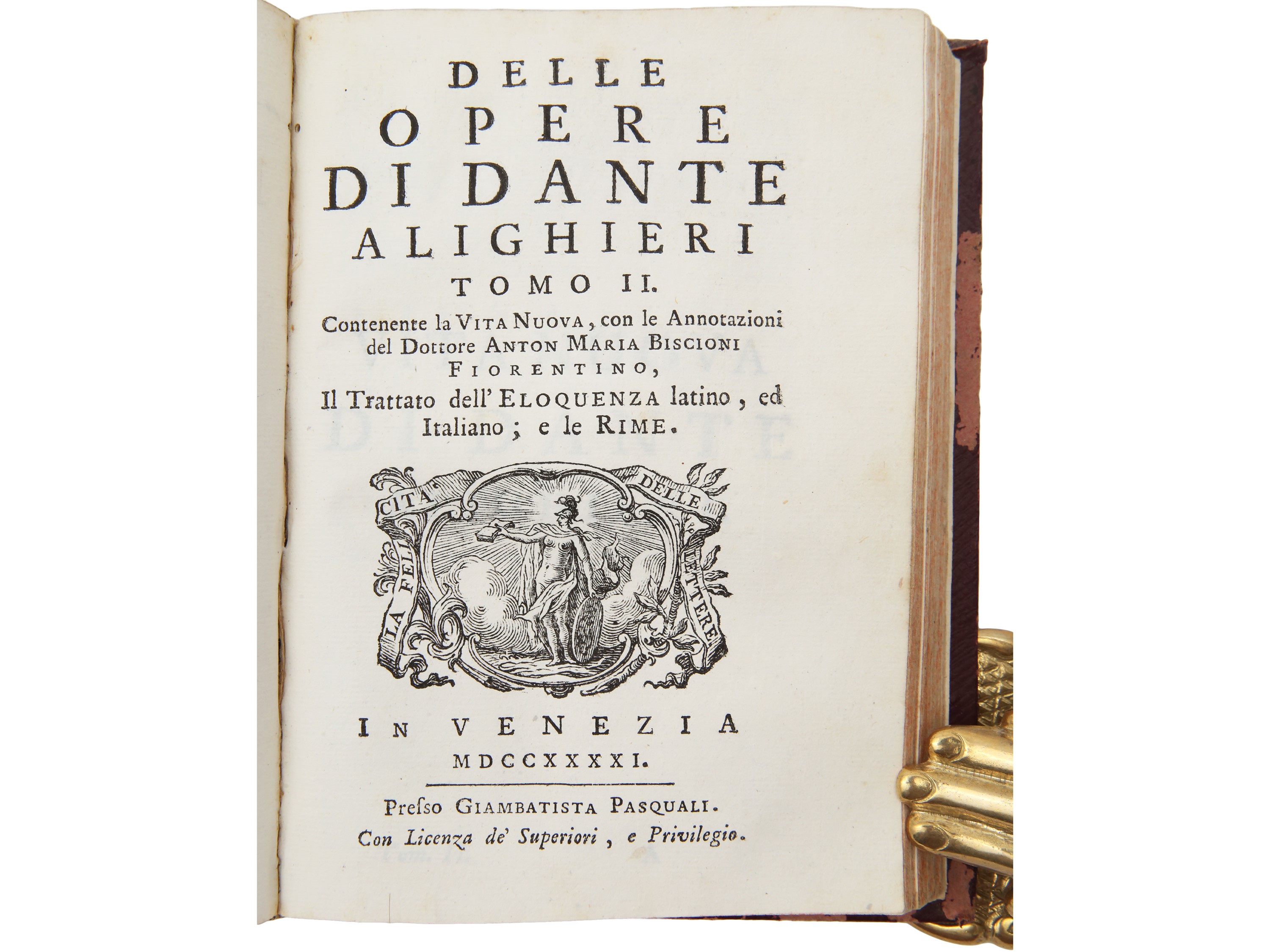 Tomo I contenente il Convito, e le Pistole con le annotazioni del dottore Anton Maria Biscioni fiorentino: [4], 286 p. - Tomo II contenente la Vita nuova, con le annotazioni del dottore Anton Maria Biscioni fiorentino, il Trattato dell'eloquenza latino, ed italiano; e le Rime: [4], 299 p.