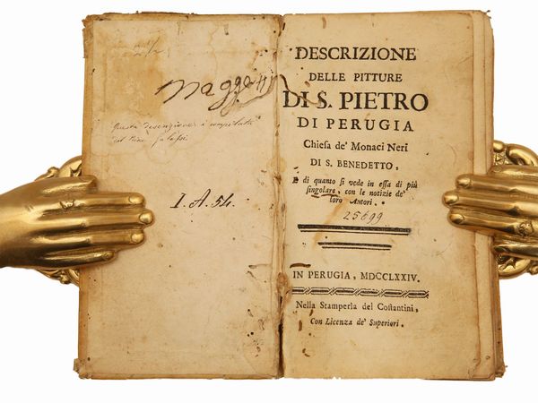 In Perugia: Nella stamperia del Costantini, 1774, 96 p. In-12° (160x85 mm). ...Chiesa de' Monaci Neri di S. Benedetto, e di quanto si vede in essa di più singolare, con le notizie de' loro Autori. Legatura coeva in piena pergamena con titolo su tassello al dorso. Difetti: fori di tarlo al dorso, che intaccano anche le carte, fioriture. Fascicolo iniziale quasi completamente staccato