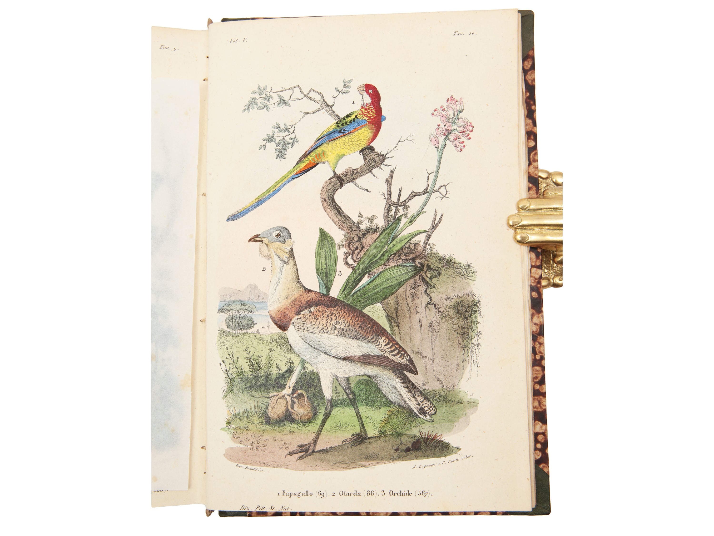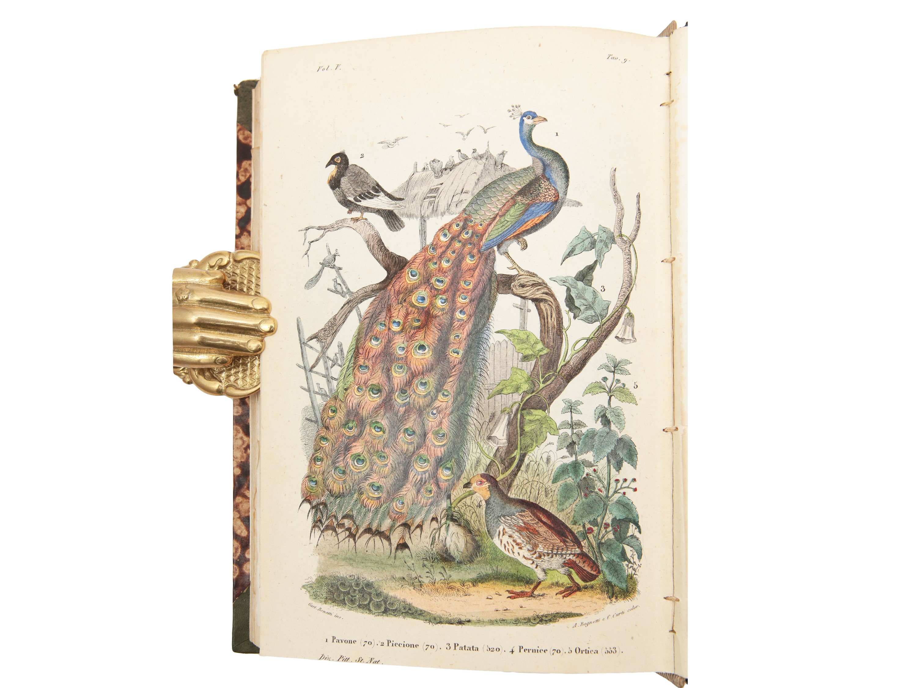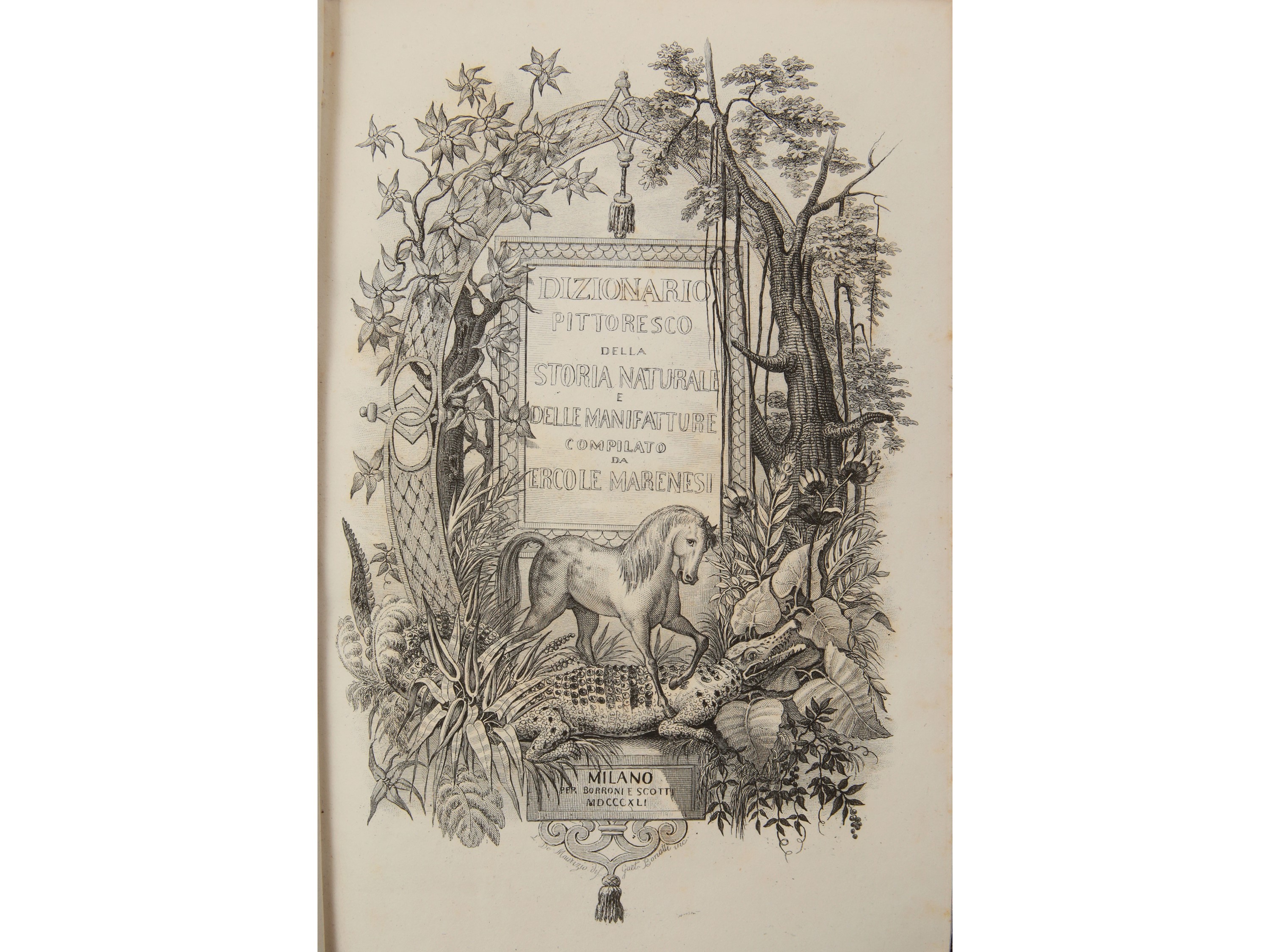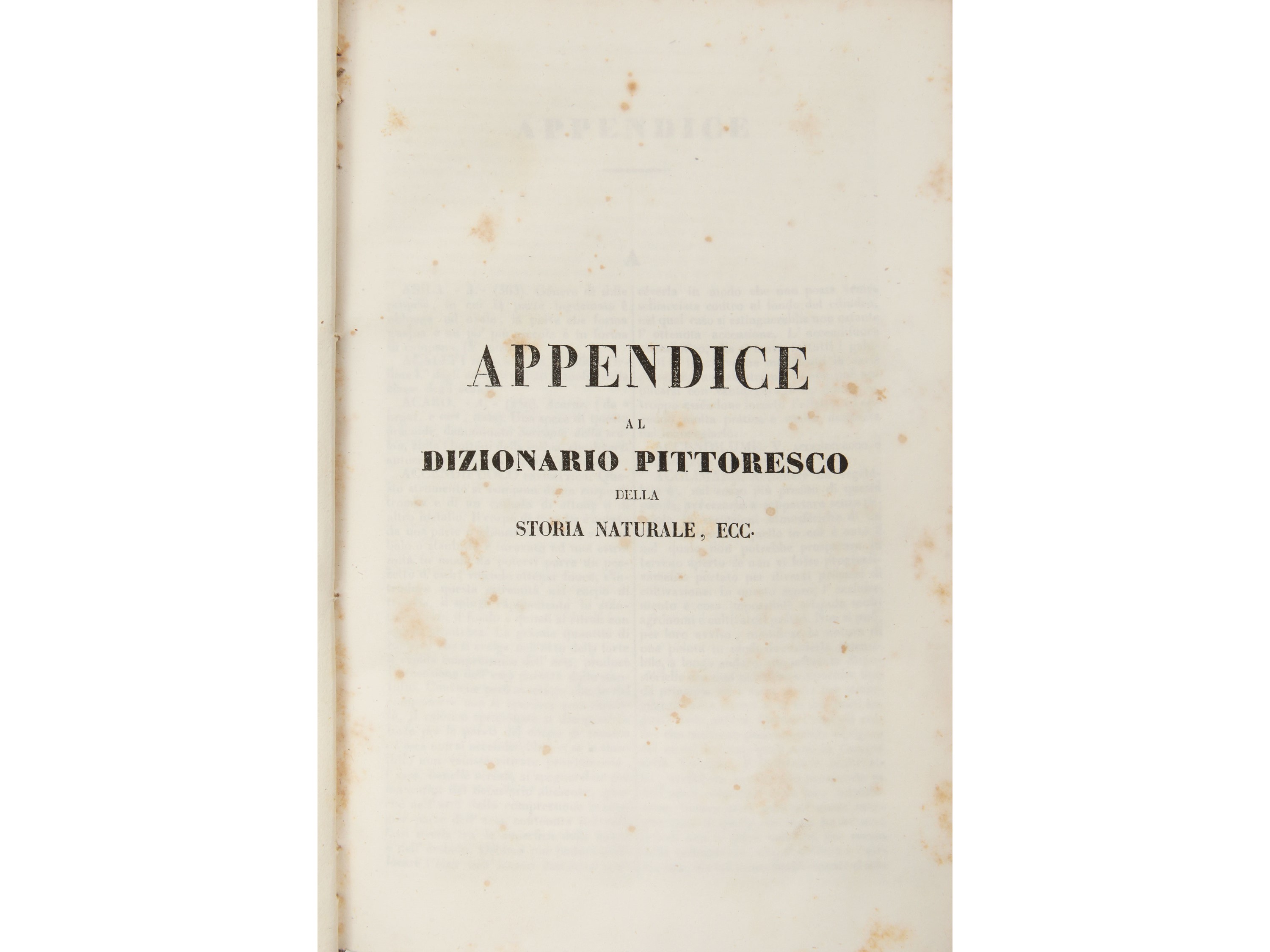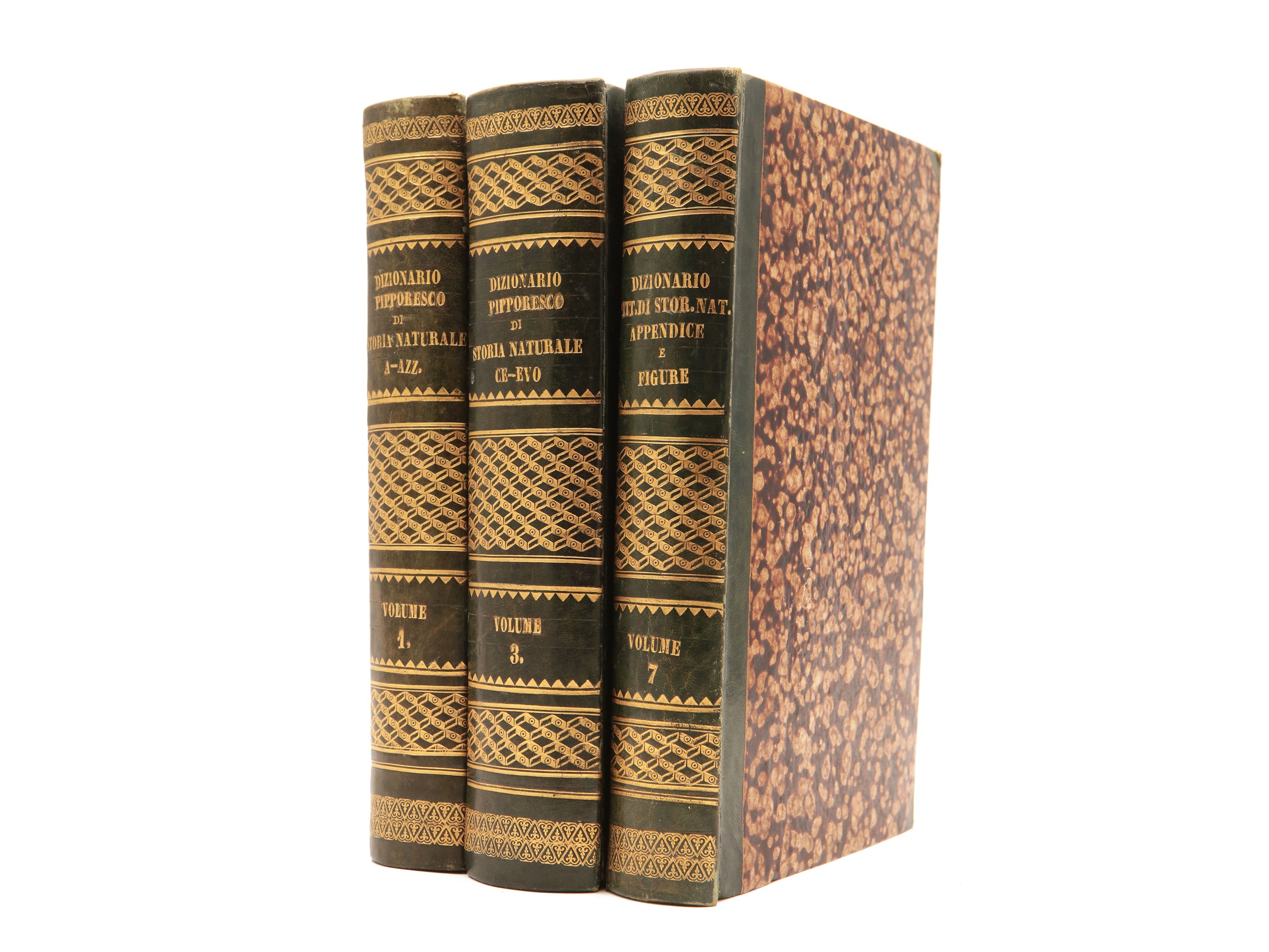 1. A-Azz: 559 p., 8 c. di tav. di cui 1 ripiegata- 3. Ce-Evo: 832 p. (mancanti pp, 551-559) - 7. Appendice: 137 p., 85 bellissime tav., incise e colorate, relative ai 6 volumi dell'opera, ad esclusione delle prime 8 tav. correttamente inserite nel primo volume. Antiporta figurata. Legature in mezza pelle. Fioriture diffuse, fortunatamente con poca incidenza sulle tavole (3)