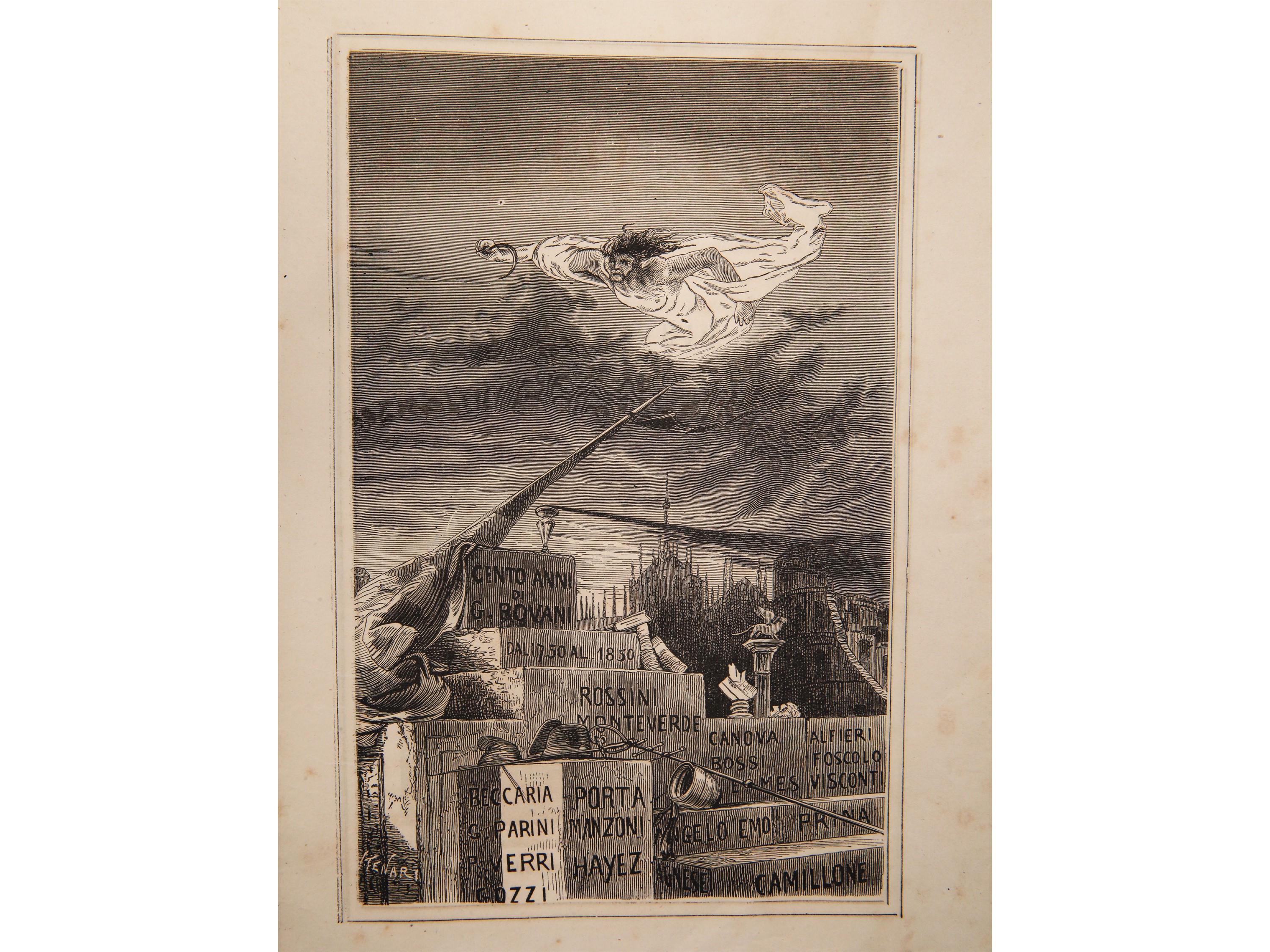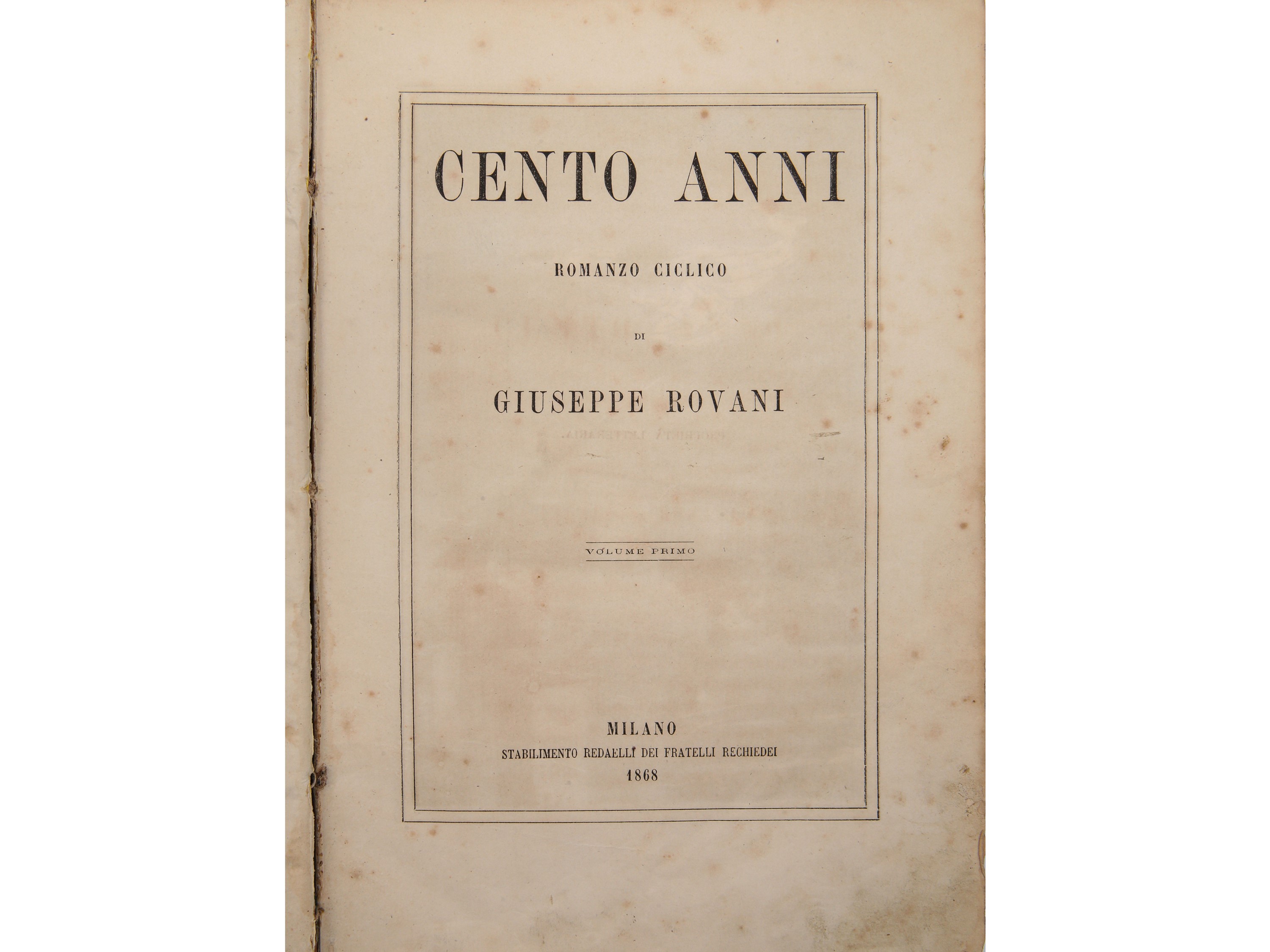 Cento Anni. Romanzo ciclico di Giuseppe Rovani, volume primo, Milano: Stabilimento Redaelli dei Fratelli Rechiedei, 1868. (255x170 mm). 653 p., ill. Testo in cornice tipografica, capilettera figurati, vignette e molte illustrazioni. Legatura in mezza pelle con ingenti danni. Fioriture, qualche macchia (2)