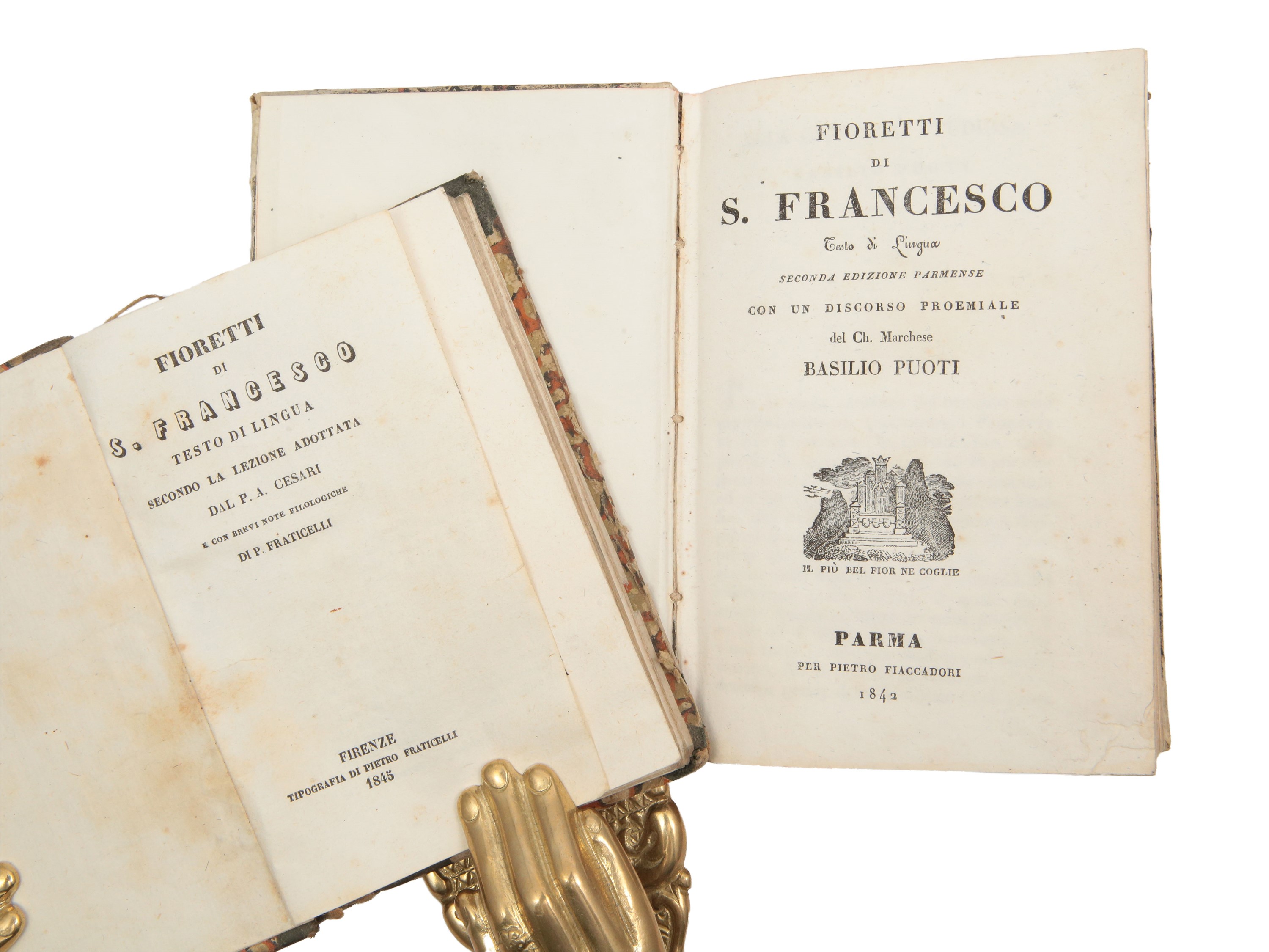 2. ed. parmense, Parma: per Pietro Fiaccadori, 1842. (150x100 mm). XII, 276 p. Legatura coeva in mz. pelle con angoli, titolo manoscritto al dorso. Lievissime fioriture. Si aggiunge un'altra ed. del testo, purtroppo incompleta: Fioretti di S. Francesco: testo di lingua secondo la lezione adottata dal P. A. Cesari con brevi note filologiche di P. Fraticelli, Firenze: Tipografia di Pietro Graticelli, 1845. (140x90 mm). p. 71-320 (pagine iniziali e finali mancanti). Legatura in mz. pelle con difetti; pagine finali tagliate (2)