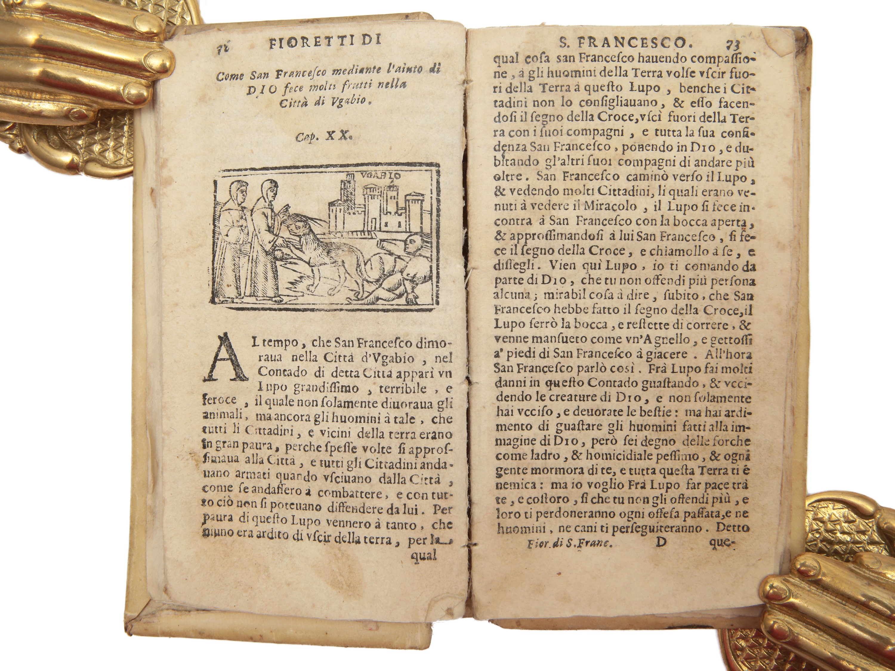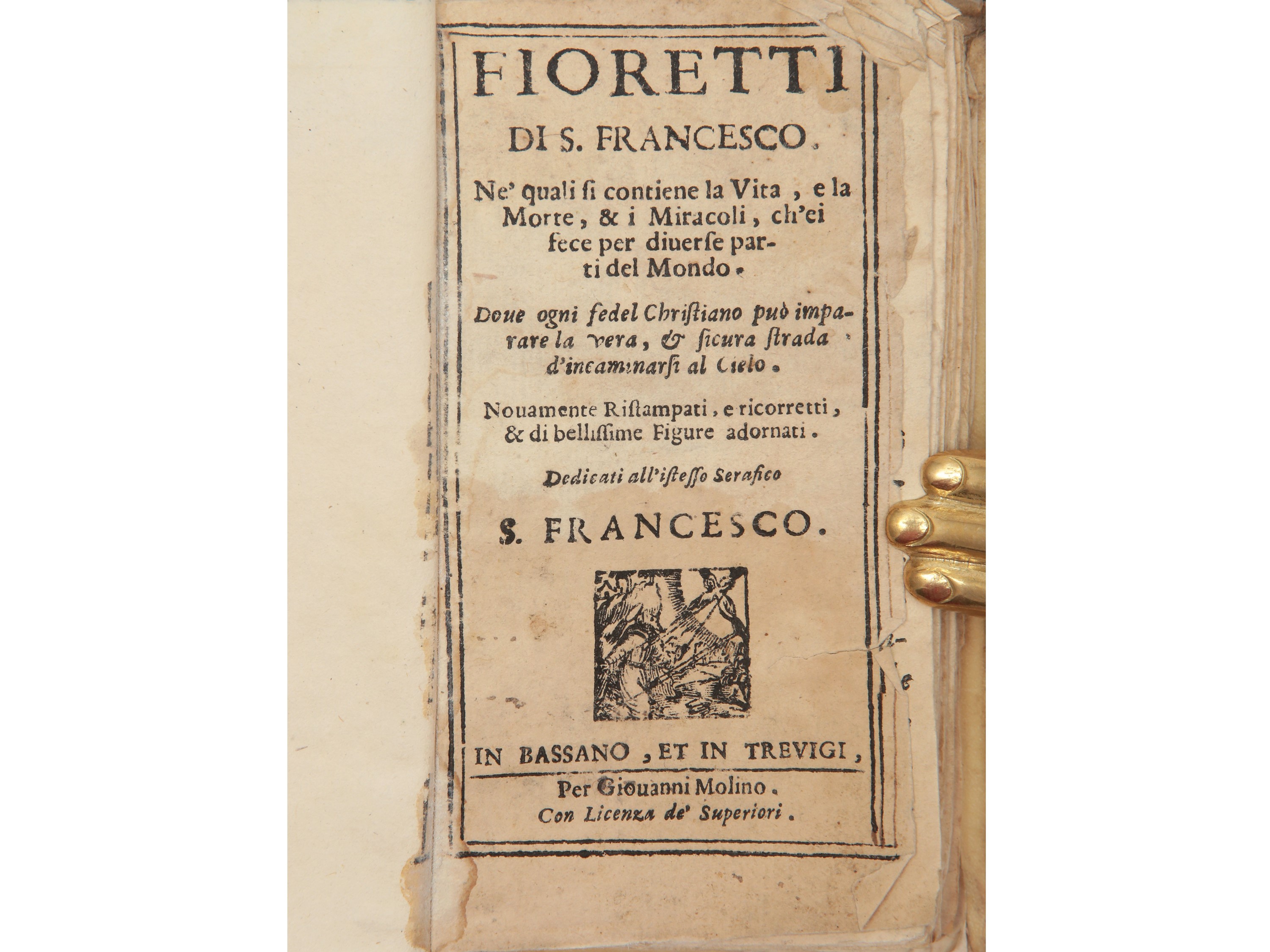 Pubblicato presumibilmente tra la fine del XVII e l'inizio del XVIII secolo, anni di attività del tipografo Giovanni Molino. Finalini, iniziali e belle vignette xilografiche nel testo sulla vita di San Francesco. Legatura coeva in piena pergamena con titolo manoscritto al dorso. Gore d'acqua, macchie, minime mancanze al frontespizio