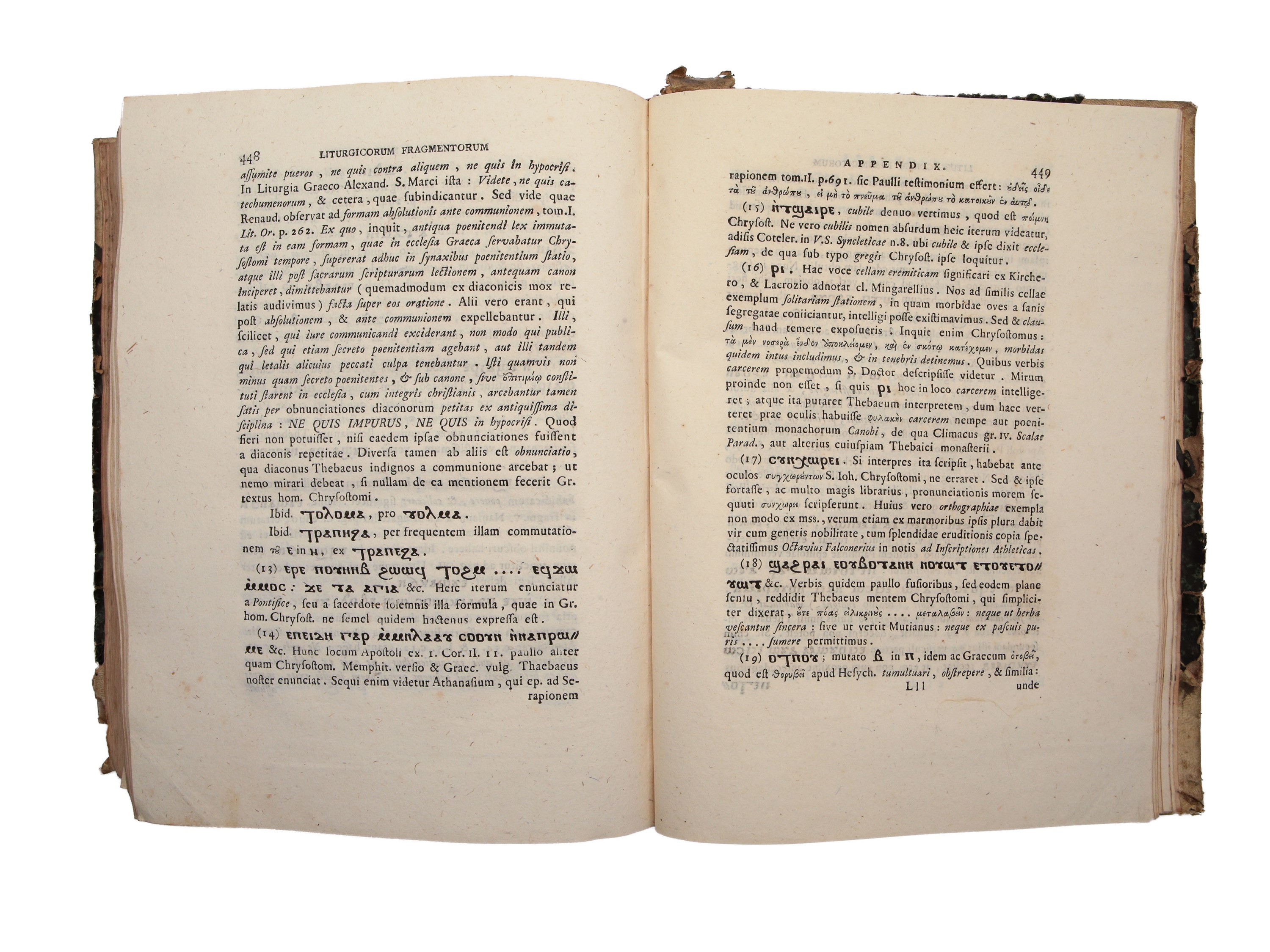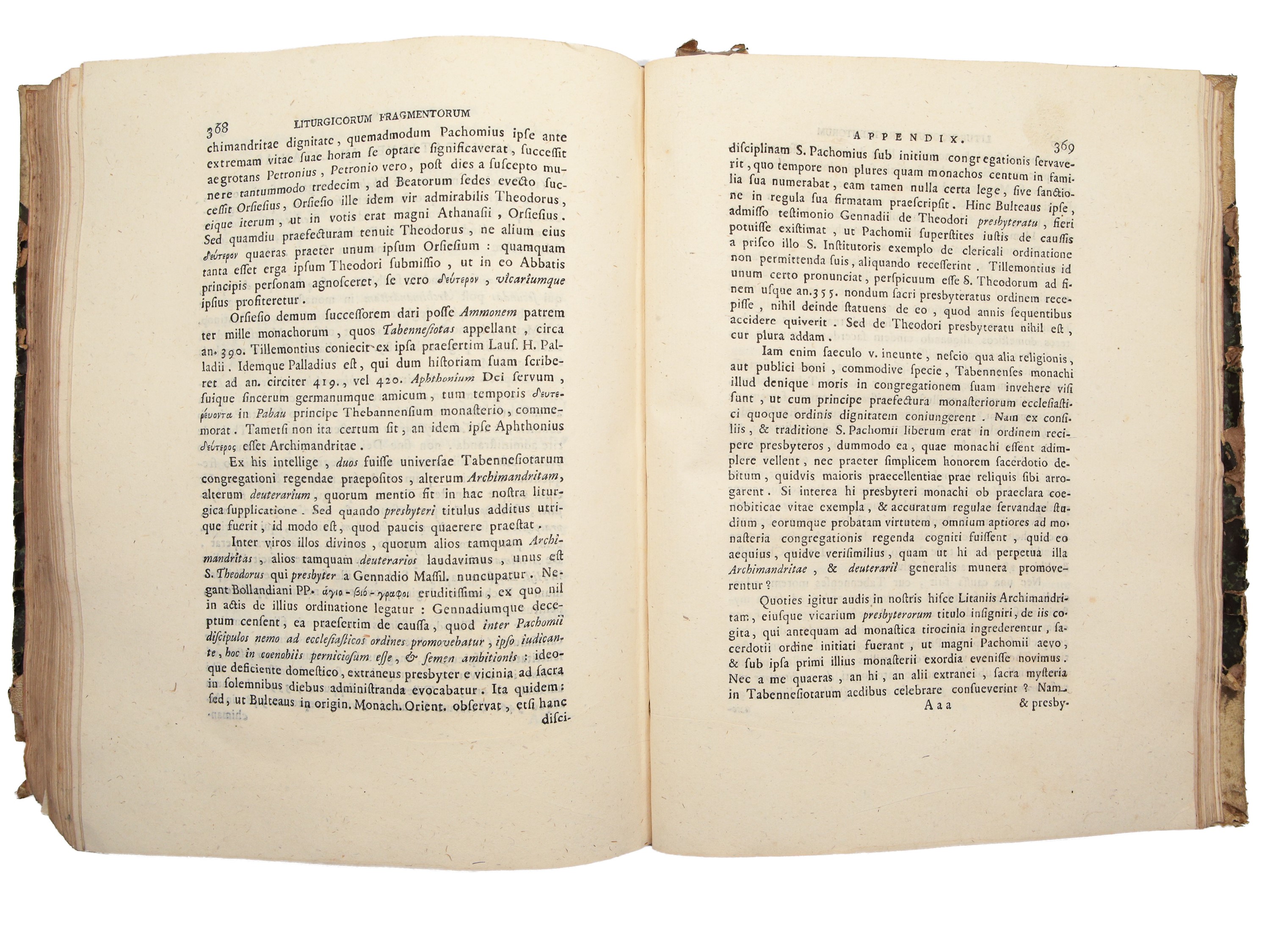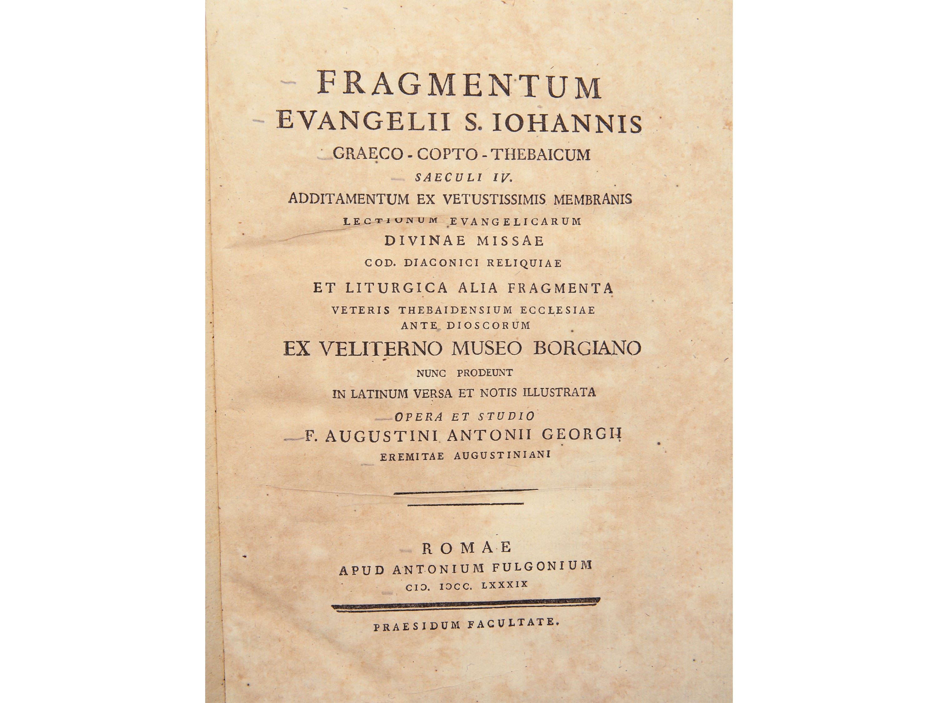 Romae: apud Antonium Fulgonium, 1789. In-4° (280x220 mm). CXCII, 488 p., 1 (di 4) carte di tav. ripiegate. Iniziali xilografiche. ...additamentum ex vetustissimis membranis lectionum evangelicarum divinae Missae cod. diaconici reliquiae et liturgica alia fragmenta veteris thebaidensium ecclesiae ante Dioscorum ex Veliterno museo Borgiano nunc prodeunt in Latinum versa et notis illustrata opera et studio F. Augustini Antonii Georgii eremitae augustiniani. Legatura coeva in mz. pergamena con angoli, con titolo su tassello al dorso, con difetti: mancanze al dorso, all'angolo del piatto anteriore e ai labbri. Fioriture, zone uniformemente brunite. Macchia a p. 388