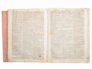 Vocabolario italiano e latino per uso delle regie scuole di Torino. Edizione ultima veneta, che oltre tutte le aggiunte già fatte a detta Opera, contiene le Voci Chimiche, di Vegetabili, di Minerali, e d'antica Erudizione. Tomo primo [-secundus], Venezia: Presso Francesco di Niccolò Pezzana, 1781, 2 voll. In-4° (250x190 mm). XX, 560, 52 p.; XVI, 625 [i.e 627] p. (ripetute nella numerazione le pp. 447-448). Testo su tre colonne. Frontespizi in rosso e nero. Legatura in mz. pelle molto danneggiata, con macchia d'inchiostro al piatto posteriore del secondo volume. Fioriture, bruniture, macchie (4)