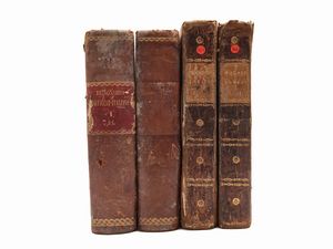 Legatura coeva in mz. pelle con (sul vol. 1) titolo al dorso in oro su tassello (caduto sul vol. 2), strappi e spellature. Fioriture diffuse, arrossature, gore di umidità.