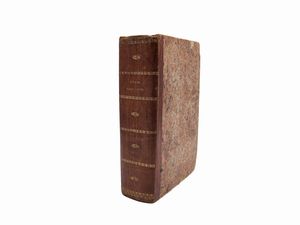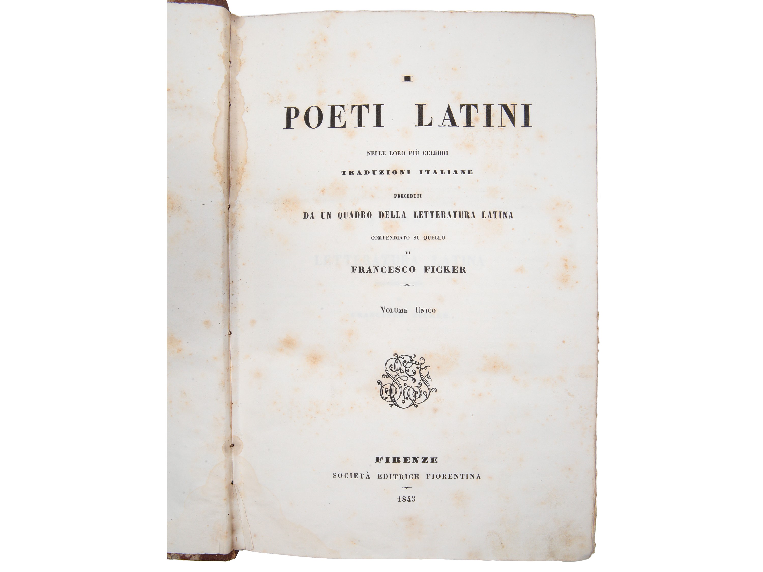 Firenze: Società Editrice Fiorentina, 1843, 1282, [2] p. (270x170 mm). ...preceduti da un quadro della letteratura latina compendiato su quello di Francesco Ficker. Volume unico. Legatura coeva in mz. pelle, ricchi fregi e titolo in oro al dorso. Segni d'uso, spellature. Fioriture diffuse