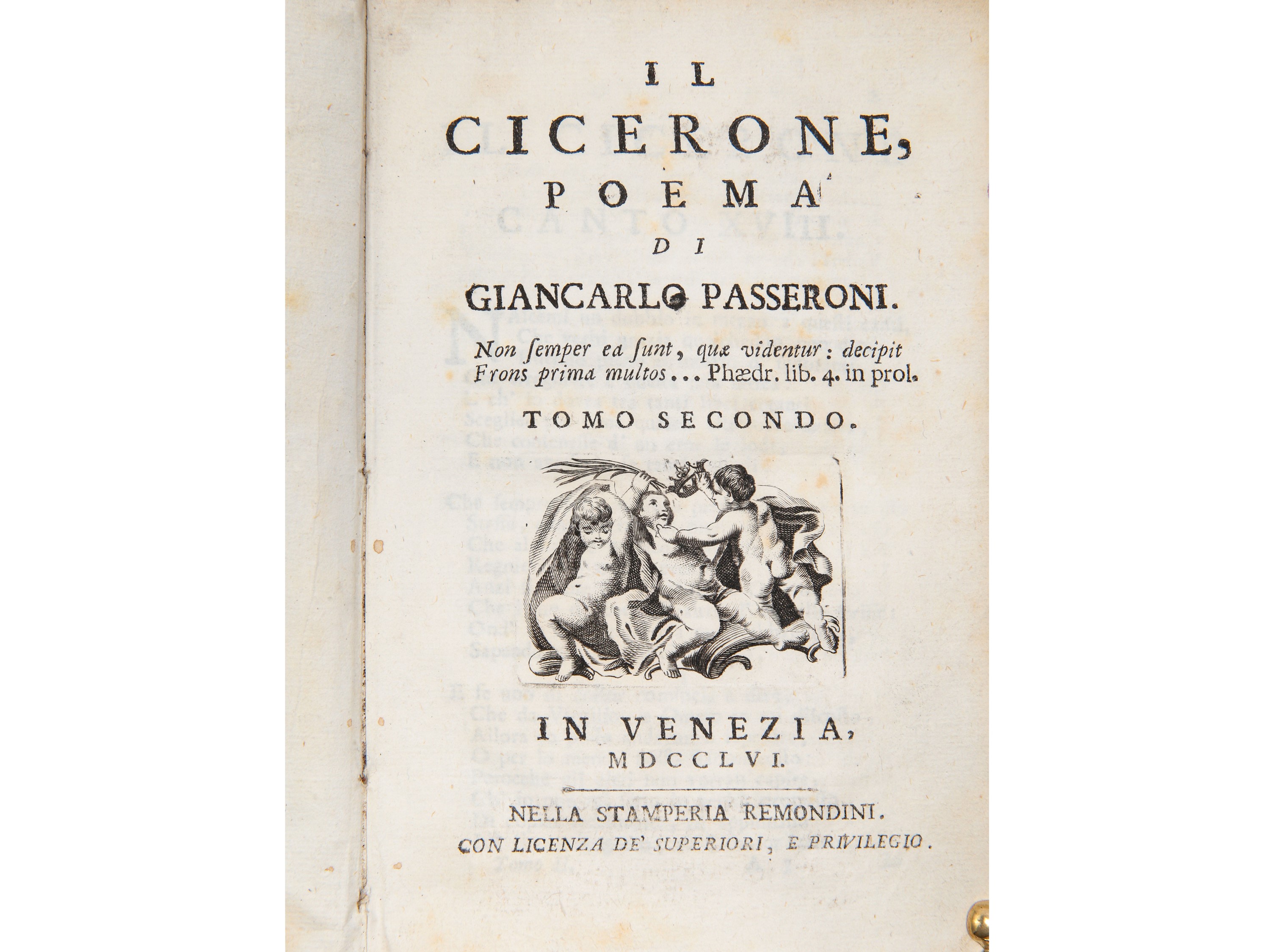 In Venezia: nella stamperia Remondini, 1756, tomo secondo (primo tomo mancante), [4], 444 p. In-8º (180x115 mm). Bella vignetta calcografica sul frontespizio, fregio xilografico in fine. Legatura coeva in piena pergamena con titolo calligrafico al dorso, piccoli fori ai piatti. Tagli spruzzati. Rare fioriture
