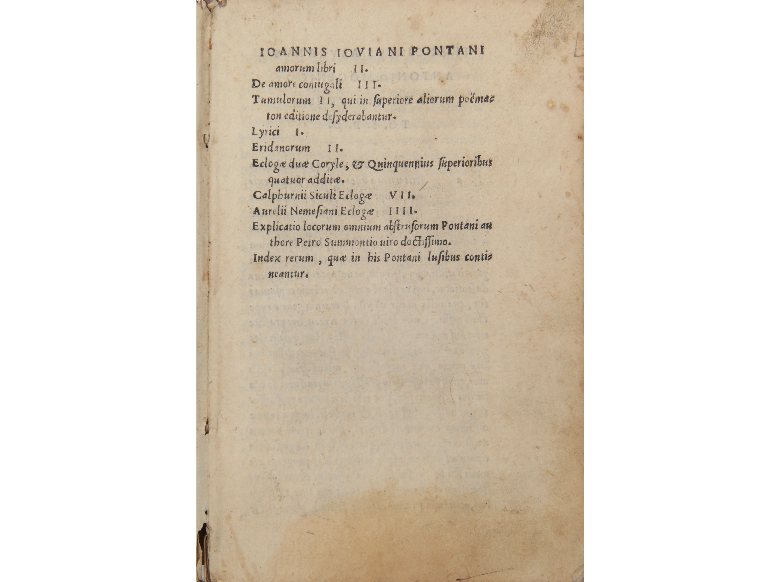 ...Tumulorum II, qui in superiore aliorum poematon editione desyderabantur. Lyrici I. Eridanorum II. Eclogae duae Coryle, & Quinquennius superioribus quatuor additae. Calphurnii Siculi Eclogae VII. Aurelii Nemesiani Eclogae IIII. Explicatio locorum omnium abstrusorum Pontani authore Petro Summontio uiro doctissimo. Index rerum, quae in his Pontani lusibus contineantur.