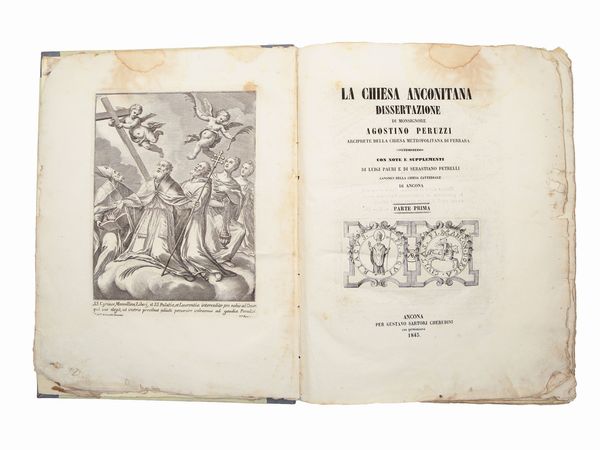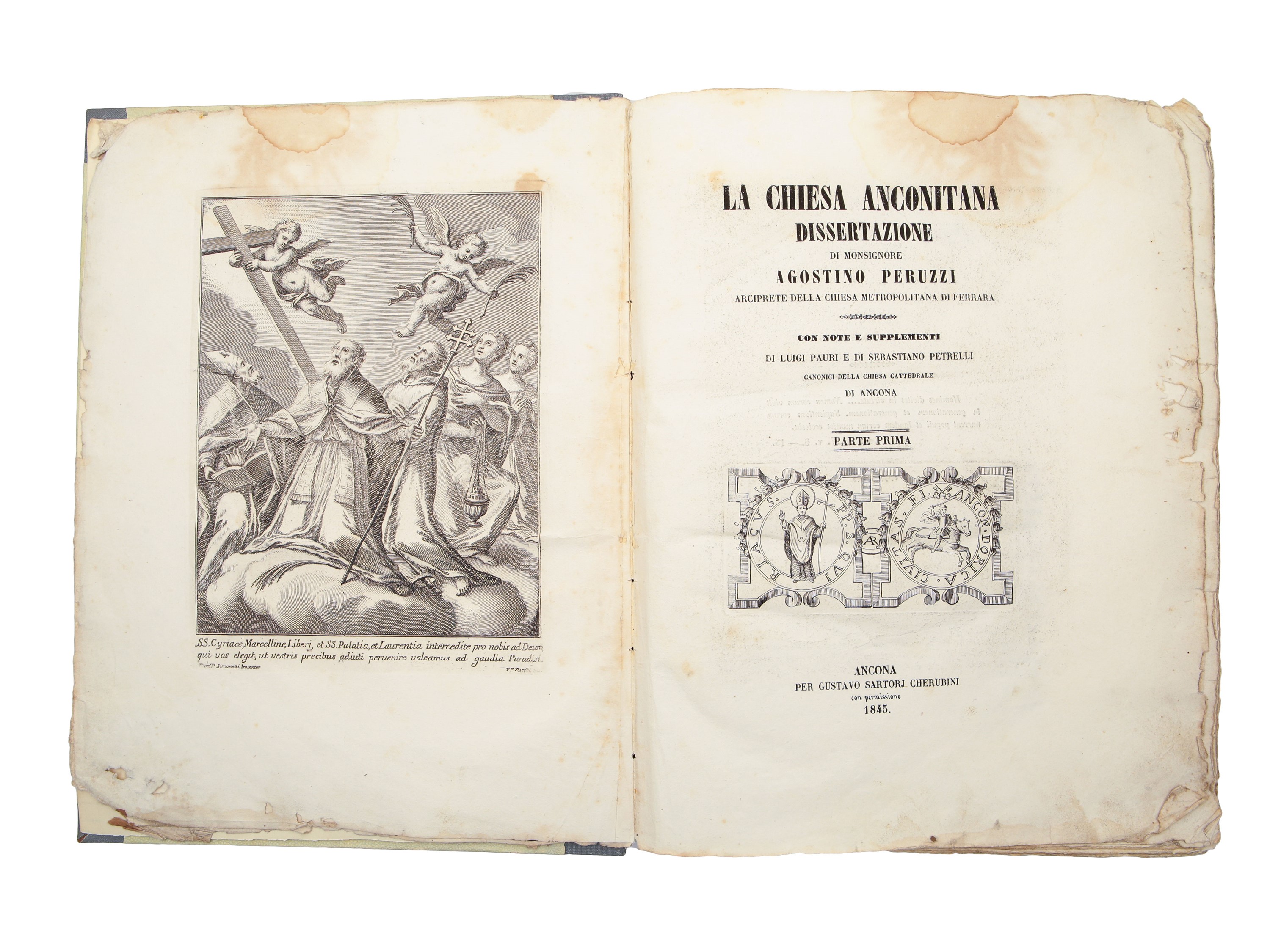 dissertazione di Agostino Peruzzi, con note e supplementi di Luigi Pauri e di Sebastiano Petrelli. Parte prima, Ancona: per Gustavo Sartorj Cherubini, 1845. (300x230 mm). [10], 241 p., 21 c. di tav. ripiegate + tavola all'antiporta incisa da Zucchi e disegnata da Simonetti (a p. 149 tavola incisa da Demetrio Dragon su disegno di Gio. Magnani).