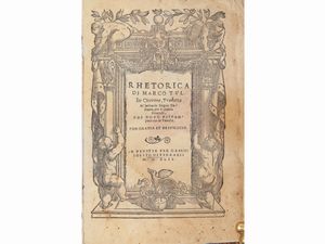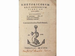 Venetiis: Aldus, 1569, In-8° (150x100 mm). 2 pt. in 1 vol.: Ciceronis: De inuentione libri II. Topica ad Trebatium. [..]