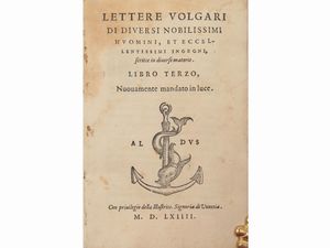 Venetiis: ex Bibliotheca Aldina, 1570. In-8° (150x100 mm). 7, 9-187 c. Mancanti c. A8 (bianca) e 2A2 (ancora [..]