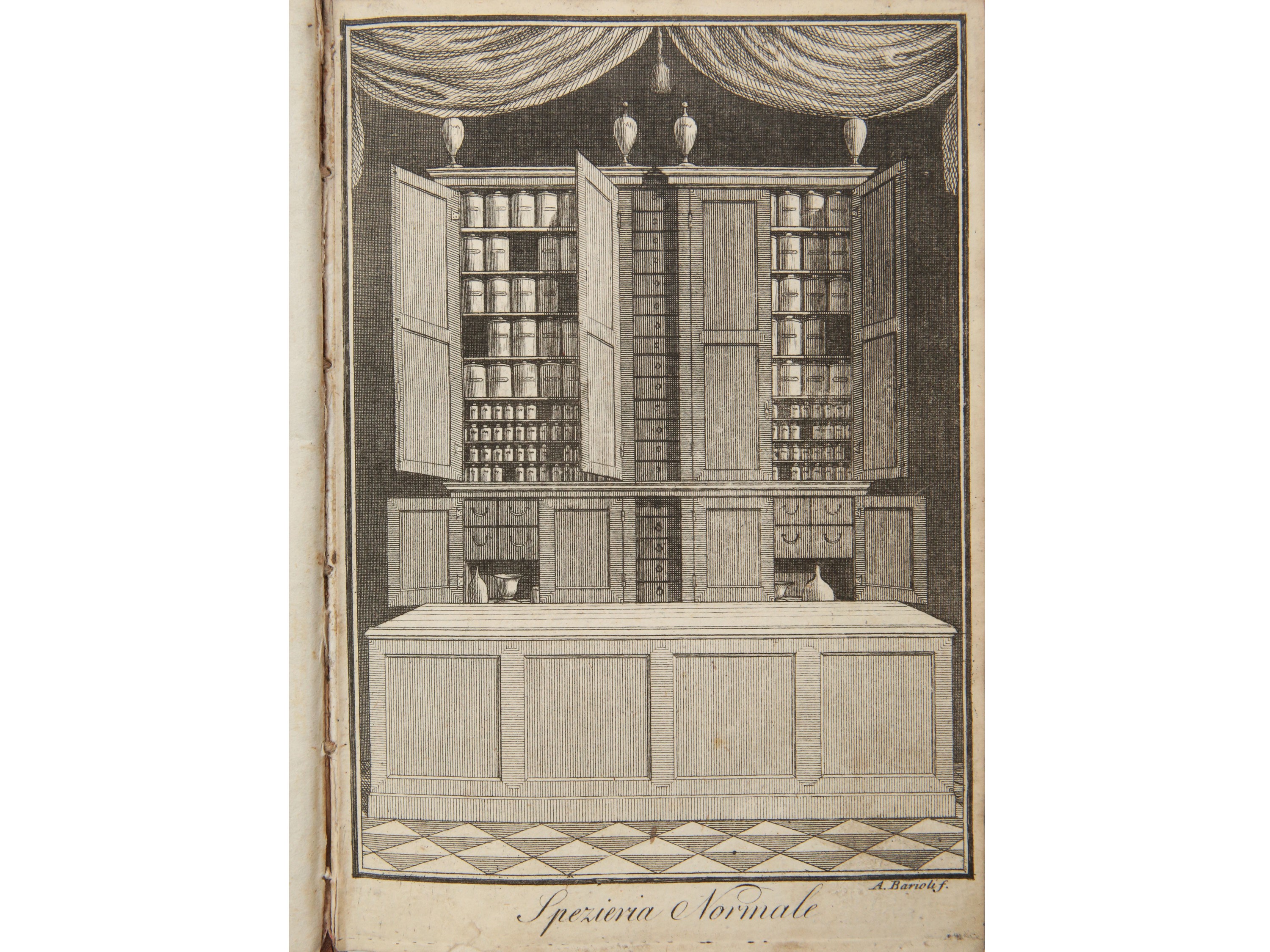 Volume primo che contiene la prima parte della teoria dell'arte: [8], XXI, [1], 335, [1] p., 1 tav. ripiegata e antiporta calcografica, che rappresenta una Spezieria normale, di A. Barioli.