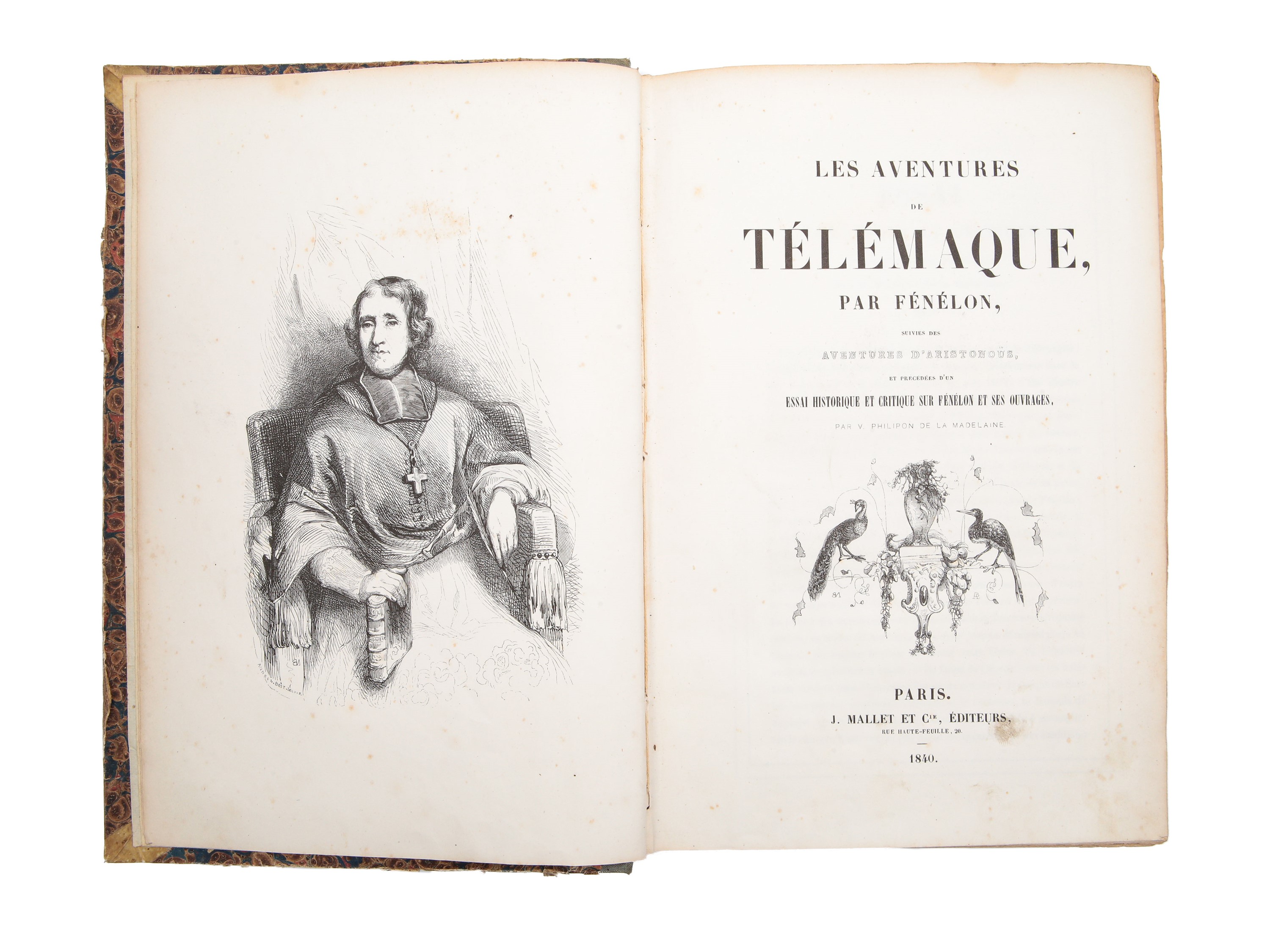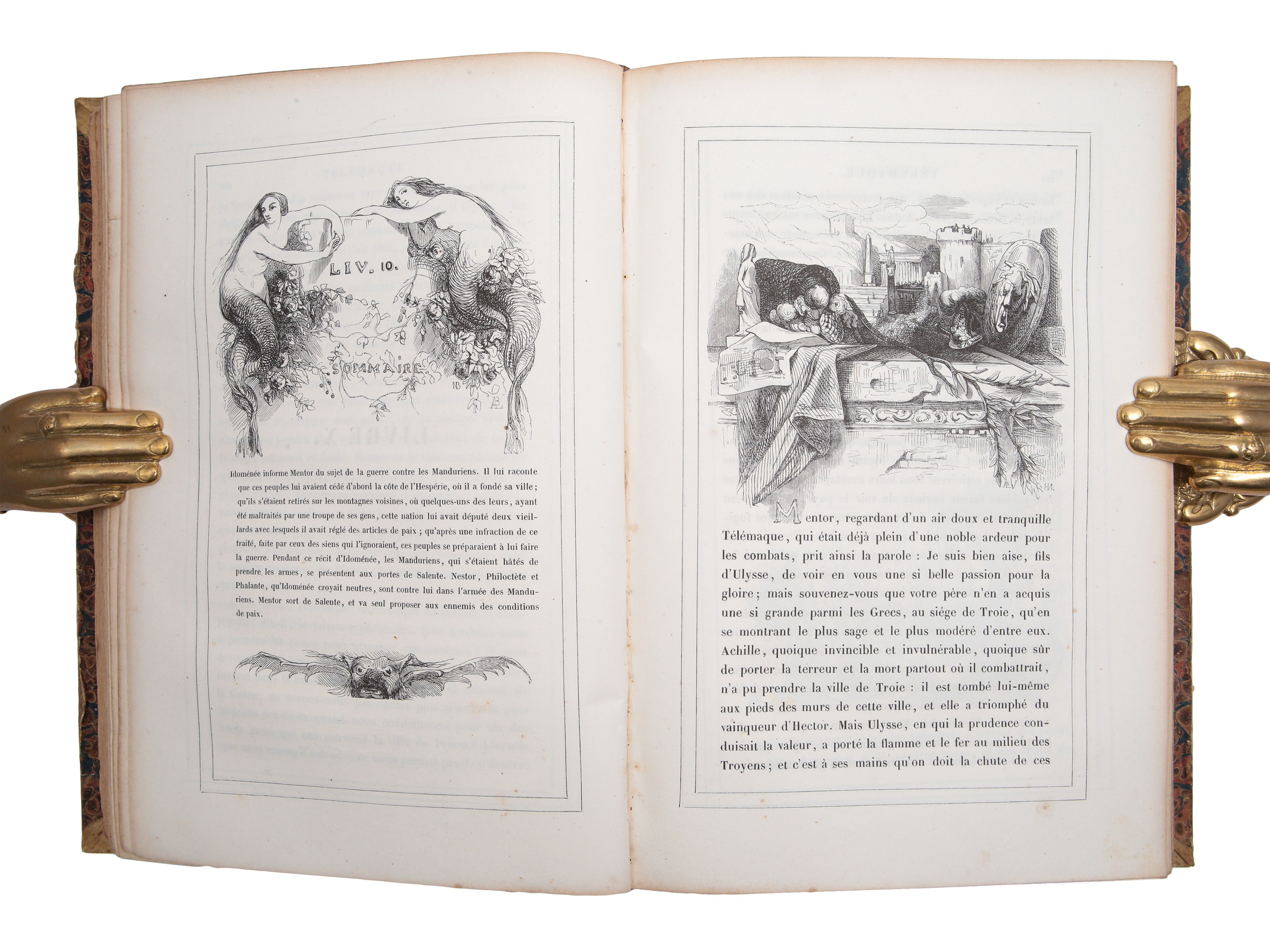 Paris: Hetzel, 1859. (265x180 mm). 254 p., ill. Legatura coeva con difetti. Tagli dorati. Fioriture e gore d'acqua diffuse. Si aggiunge: Les aventures de Télémaque; suivies des Aventures d'Aristonoüs, Paris: J. Mallet et C.ie, 1840 (Imprimé par Béthune et Plon). (250x175 mm). XVII, 590 p., 12 c. di tav., ill. (ritratto dell'autore all'antiporta). Legatura coeva con difetti. Fioriture e bruniture diffuse (2)