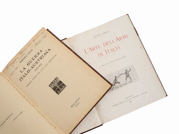Bergamo: Istituto italiano d'arti grafiche, 1906, 160 p., con 224 ill. (260x190 mm). Legatura in piena pelle con titolo in oro al piatto anteriore. Minime fioriture all'occhietto e al frontespizio. Si aggiungono: - Amedeo Tosti, La guerra italo-austriaca: 1915-1918. Sommario storico con otto carte dimostrative, Milano: Alpes, 1925, 330 p., 9 c. di tav. (245x185 mm). Legatura in mz. pelle con titolo in oro al dorso. Dedica al frontespizio. Lievi fioriture - Due riviste rilegate sulla storia delle armi (4)
