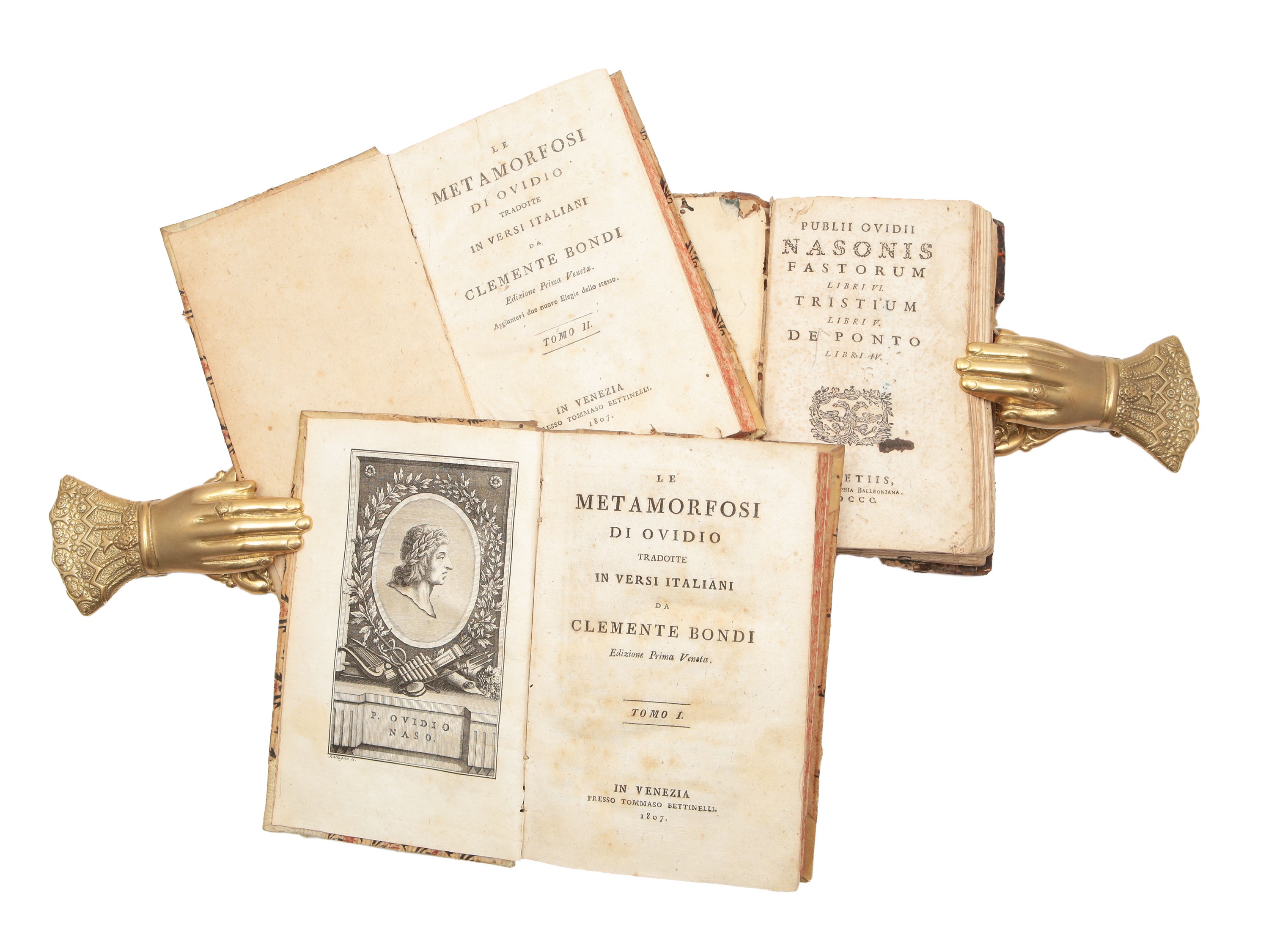 Publii Ovidii Nasonis Fastorum libri VI Tristium Libri V De Ponto libri IV, Venetiis: Ex Typographia Balleoniana, 1800. In-12° (160x90 mm). 396 p. Legatura coeva muta danneggiata. Fioriture diffuse, macchie, strappi (3)