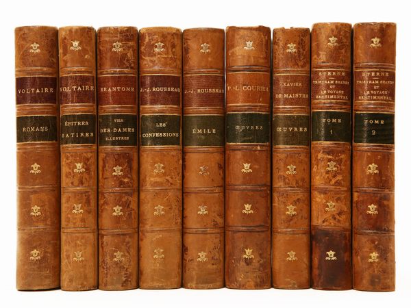 contiene i seguenti volumi ottocenteschi dell'editore parigino Garnier Frères: - Epitres, satires contes, épigrammes de Voltaire - Romans de Voltaire suivis se ses Contes en verse - Brantome, Vies des Dames illustres françoises et étrangères - Les confessions de J.-J. Rousseau - Emile ou de l'Education par J.-J. Rousseau - Oeuvres de P.-L. Courier - Oeuvres complètes du conte Xavier de Maistre - Sterne, Tristam Shandy et le voyage sentimental traduit de l'anglais, 2 voll. Belle legature in mz. pelle con titoli su tasselli ai dorsi. Tagli marmorizzati. Rare fioriture: possibili difetti non segnalati (9)