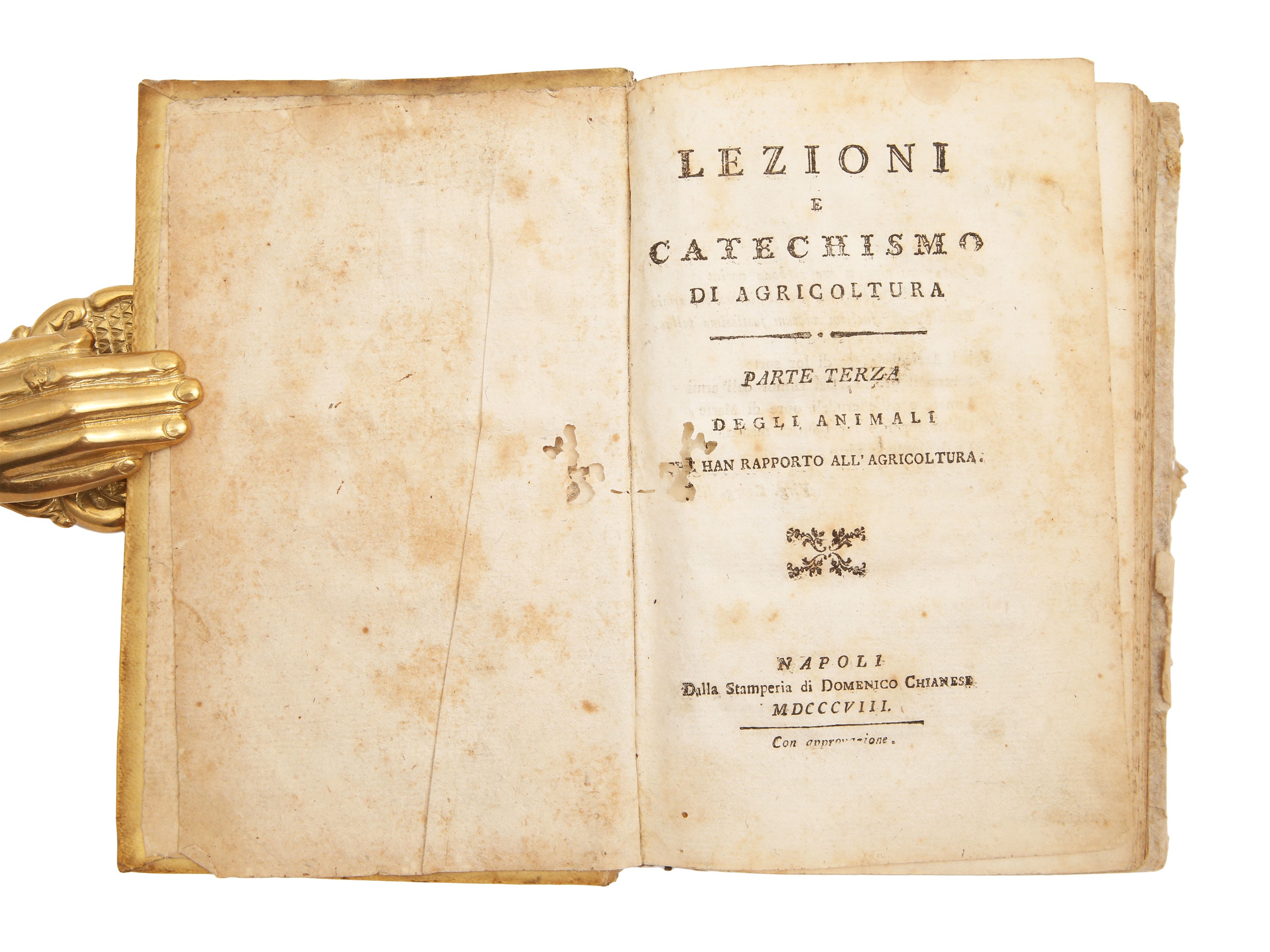 Napoli: dalla stamperia di Domenico Chianese, 1808, 232 p. In-8°. (195x125 mm). Parte terza: degli animali che han rapporto all'agricoltura, Legatura coeva con titolo in oro al dorso; piatto posteriore mancante. Importanti gallerie di tarlo che intaccano le carte iniziali. Fioriture diffuse
