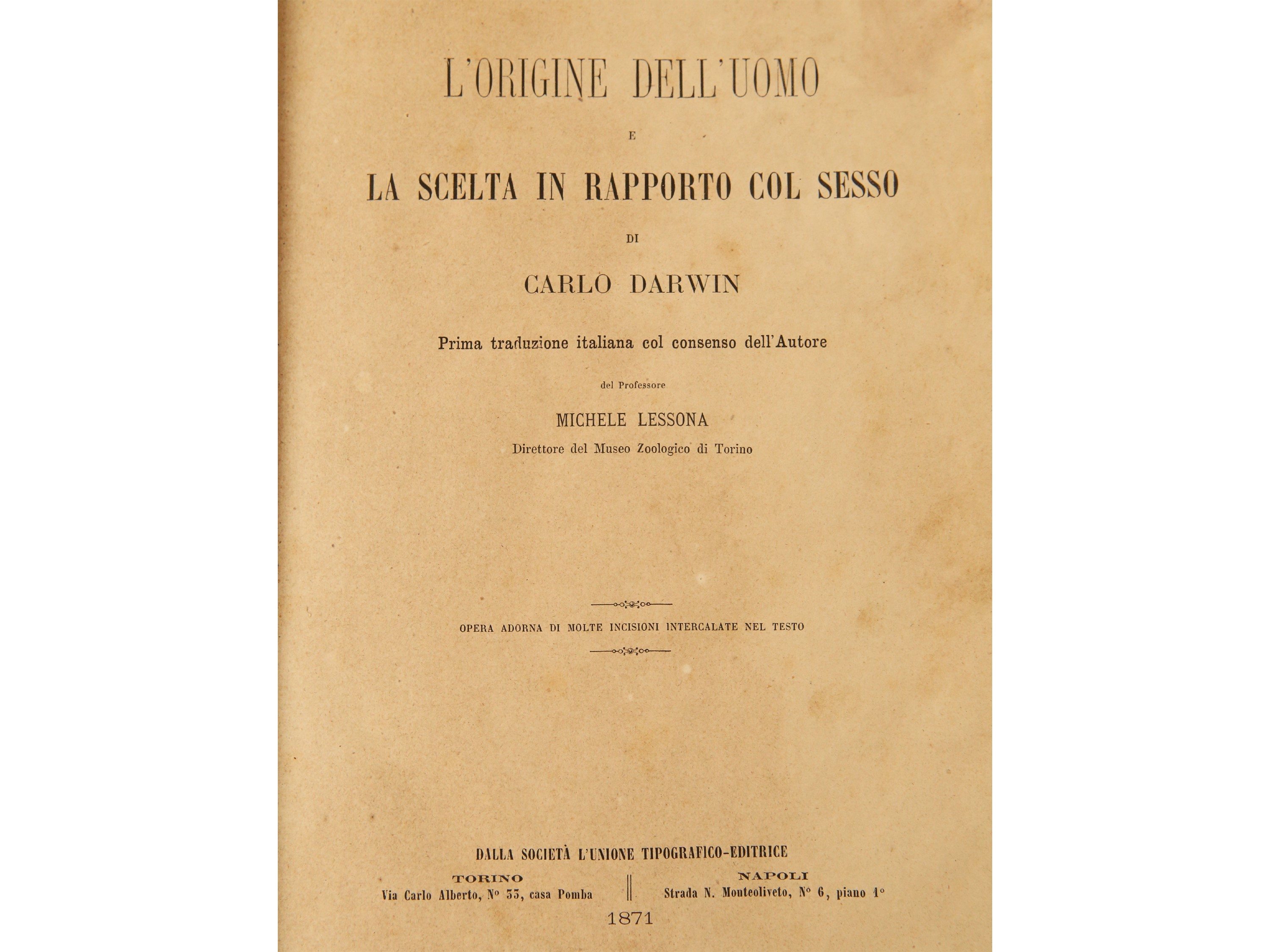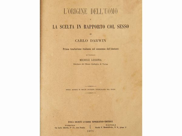 Torino-Napoli: dalla Società L'Unione tipografico-editrice, 1871. In-4° (270x180 mm), 672 p. Prima traduzione italiana col consenso dell'autore del professore Michele Lessona. Opera adorna di molte incisioni intercalate nel testo. Legatura coeva in mz. pelle con ricchi fregi e titolo in oro al dorso a 6 nervi rilevati. Ampie mende ai piatti. Macchie di umidità in testa e in coda al volume, rare fioriture