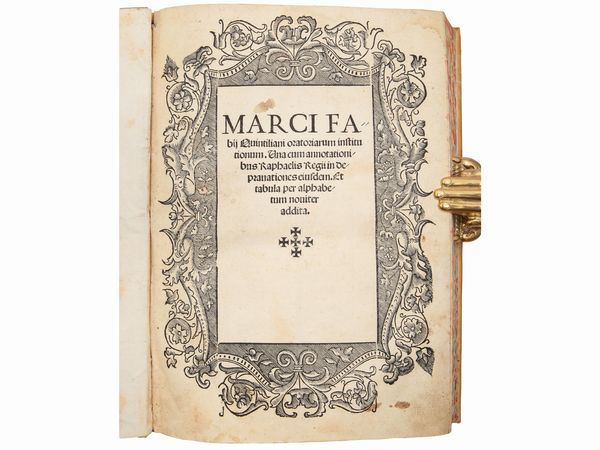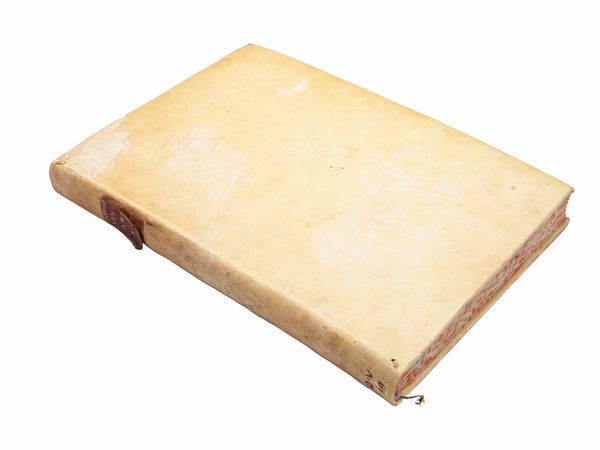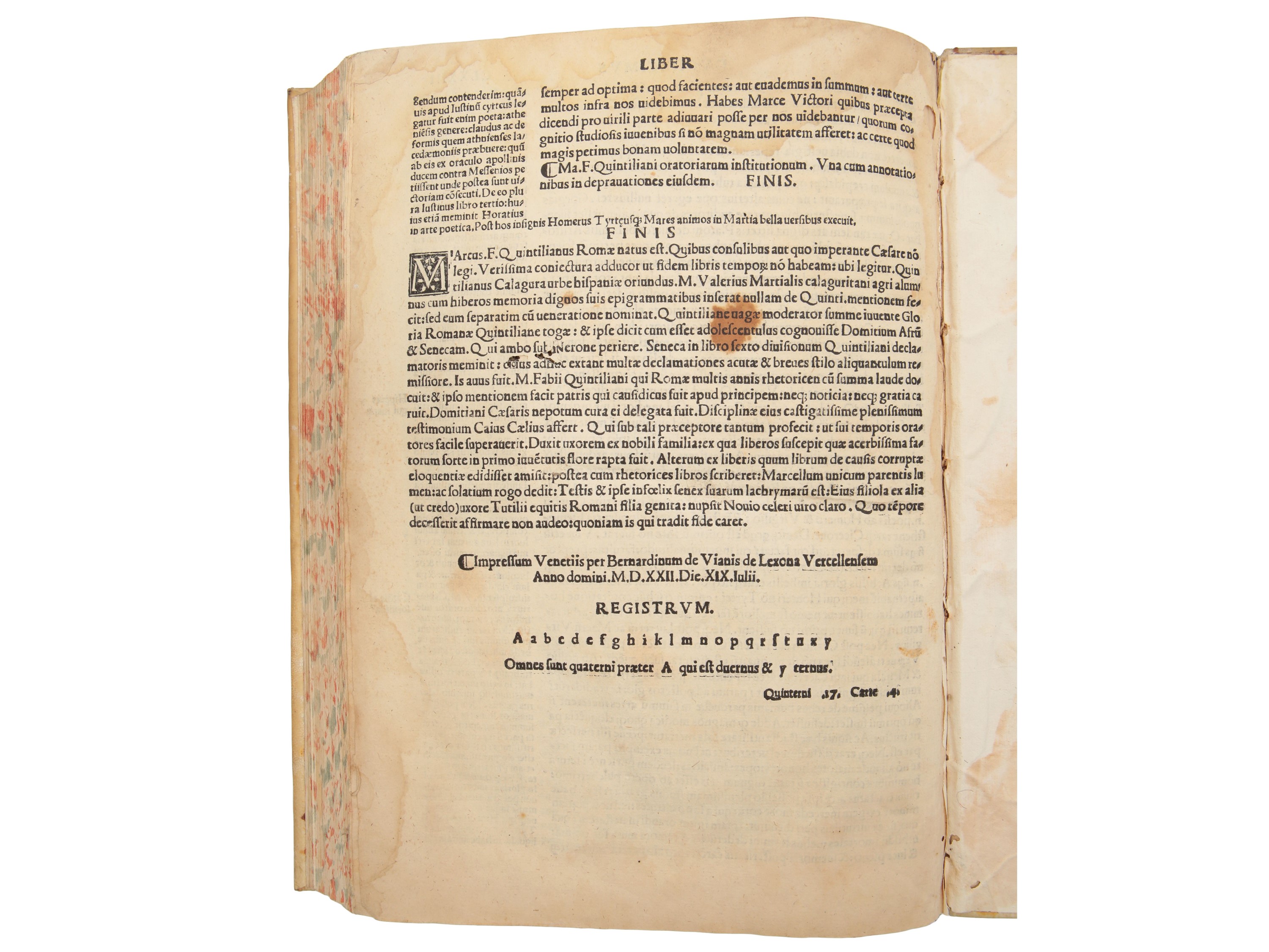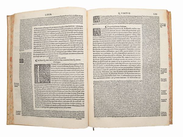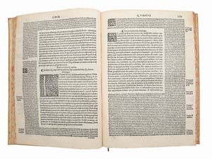Impressum Venetiis: per Bernardinum de Vianis de Lexona Vercellensem, 1522 die XIX Iulii. In folio (300x210 mm). [4], CLXXIII c. Collazionato, completo: mancante l'ultima c. y6 bianca) Segnatura: A4 a-x8 y6. ...Una cum annotationibus Raphaelis Regii in deprauationes eiusdem. Et tabula per alphabetum nouiter addita. Iniziali xilografiche. Legatura in piena pergamena con titolo su tassello al dorso; qualche difetto. Tagli marmorizzati. Gore d'acqua, fioriture, piccole gallerie di tarlo, zone brunite, rare macchie