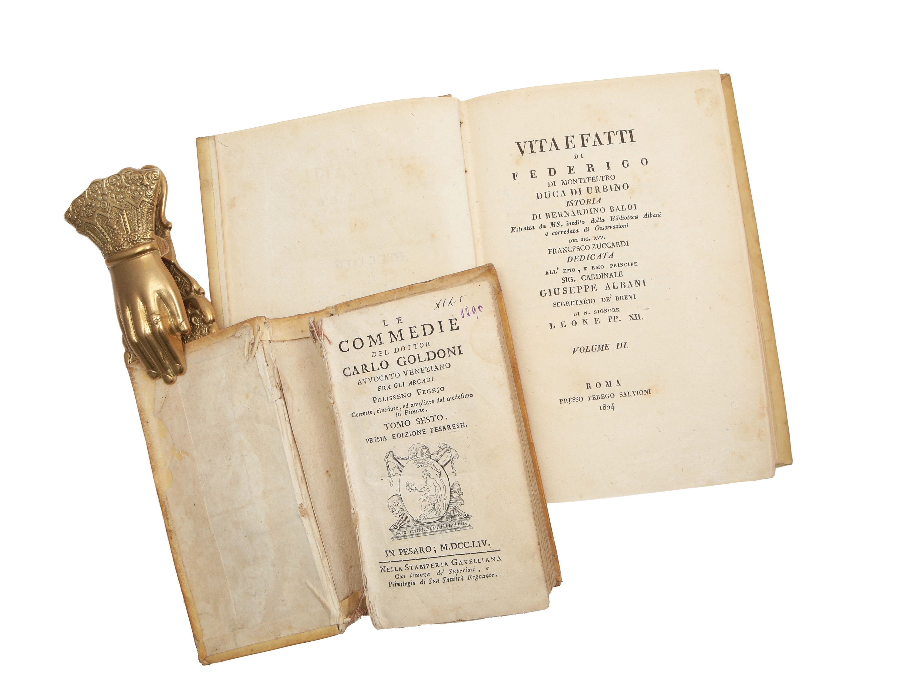 - Bernardino Baldi, Vita e fatti di Federigo di Montefeltro duca di Urbino istoria di Bernardino Baldi estratta da Ms. inedito della Biblioteca Albani, e corredata di osservazioni del sig. avv. Francesco Zuccardi, Roma: per Perego Salvioni, 1824, vol. 3 (mancanti i voll. 1 e 2). (220x150 mm). 398 [i.e. 298] p. (le p. 283-298 erroneamente numerate 383-398). Legatura in piena pergamena rifatta, con titolo in oro su tassello al dorso. Lievi fioriture.